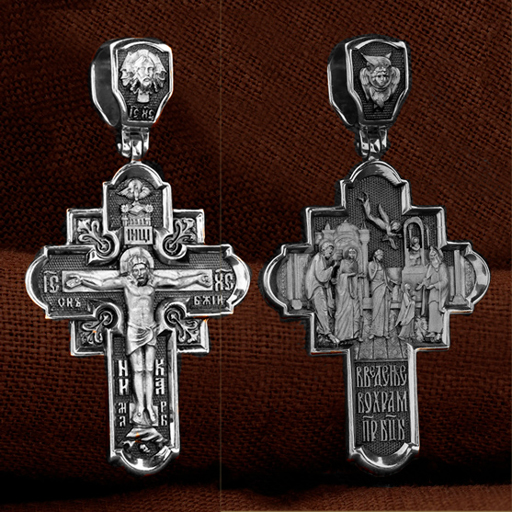 На лицевой стороне креста изображено Распятие Господа и Спасителя нашего Иисуса Христа. Крест- символ спасения и искупления рода человеческого, знамение победы над смертью и адом. Иисус Христос, как искупительная жертва освобождения человечества от власти греха, умер крестной смертью и в третий день воскрес. Верхняя перекладина символизирует титло — табличку, на которой, согласно Евангелию, было начертано: Иисус Назорей Царь Иудейский (IНЦI). Надпись «IC» «ХC», означает Иисус Христос, помещается на разных сторонах поперечной перекладины креста. Ниже перекладины расположено словосочетание «СЫН БОЖИЙ», что означает божественную природу Иисуса Христа. Надпись «МЛРБ» — «место лобное рай бысть» означает, что место лобное стало раем и помещаются в нижней части креста. Рядом — слово «НИКА», что означает «победитель». Возвышение, на котором стоит Крест, символизирует гору Голгофу, на которой произошло Распятие. Под подножием Креста изображена покоящаяся голова (череп) Адама. На кулонном кольце изображен Нерукотворный образ Господа и Спасителя нашего Иисуса Христа, чудесно отпечатавшийся на плате, которым Христос вытер свой лик. Ниже надпись — «IC» «ХC».