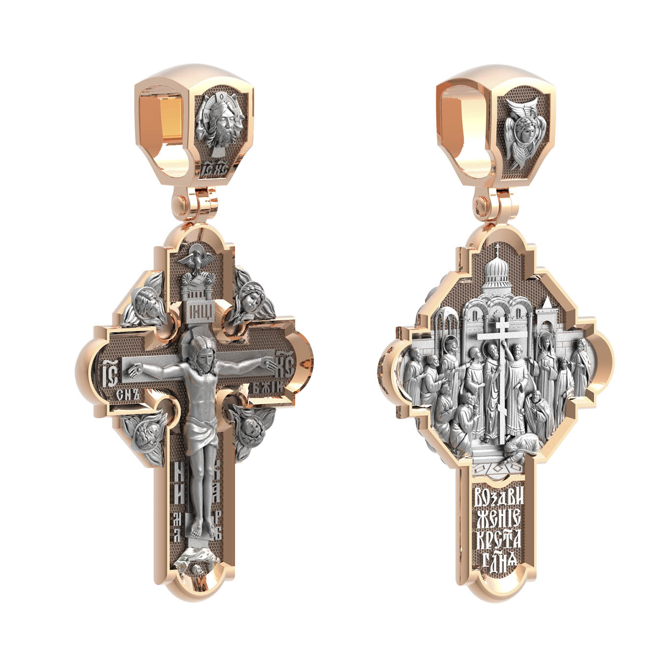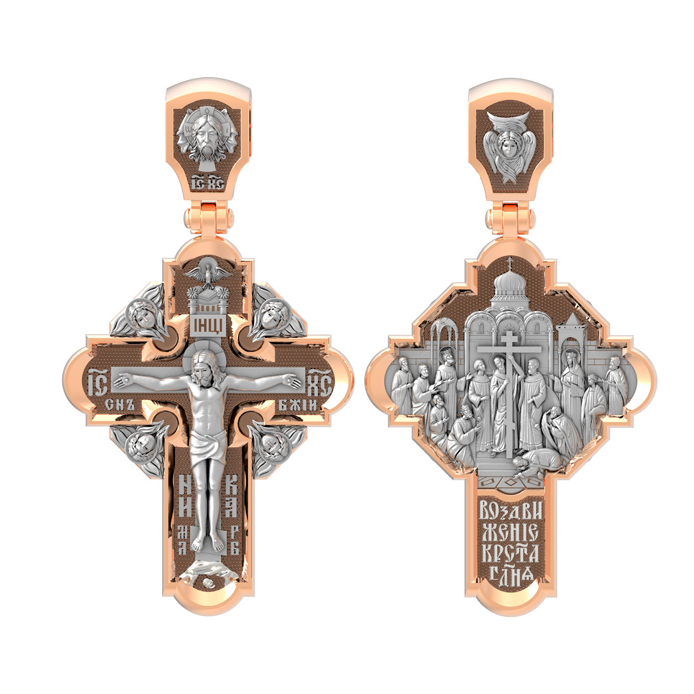 На оборотной стороне креста изображена икона Воздвижение Честного и Животворящего Креста Господня. Равноапостольный царь Константин пожелал построить храмы Божии на священных для христиан местах в Палестине и найти Крест, на котором был распят Спаситель. Исполнить желание царя взялась, с великою радостью, его мать, св. равноапостольная царица Елена. Крест был обретен в 326 году около горы Голгофы в Иерусалиме. C VII века с этим днём стали соединять память о возвращении Животворящего Креста из Персии византийским императором Ираклием (629). Праздник называется Воздвижением Креста, потому что и при обретении, и при возвращении Креста патриарх Макарий поднимал (Воздвигал) крест три раза, чтобы все могли его видеть. Народ же, видя Крест Спасителя, кланялся и восклицал: «Господи, помилуй!». Св. равноапостольные цари Константин и Елена, над местом страданий, погребения и воскресения Иисуса Христа построили обширный и великолепный храм в честь Воскресения Христова. На кулонном кольце изображен шестикрылый Ангел — Серафим.