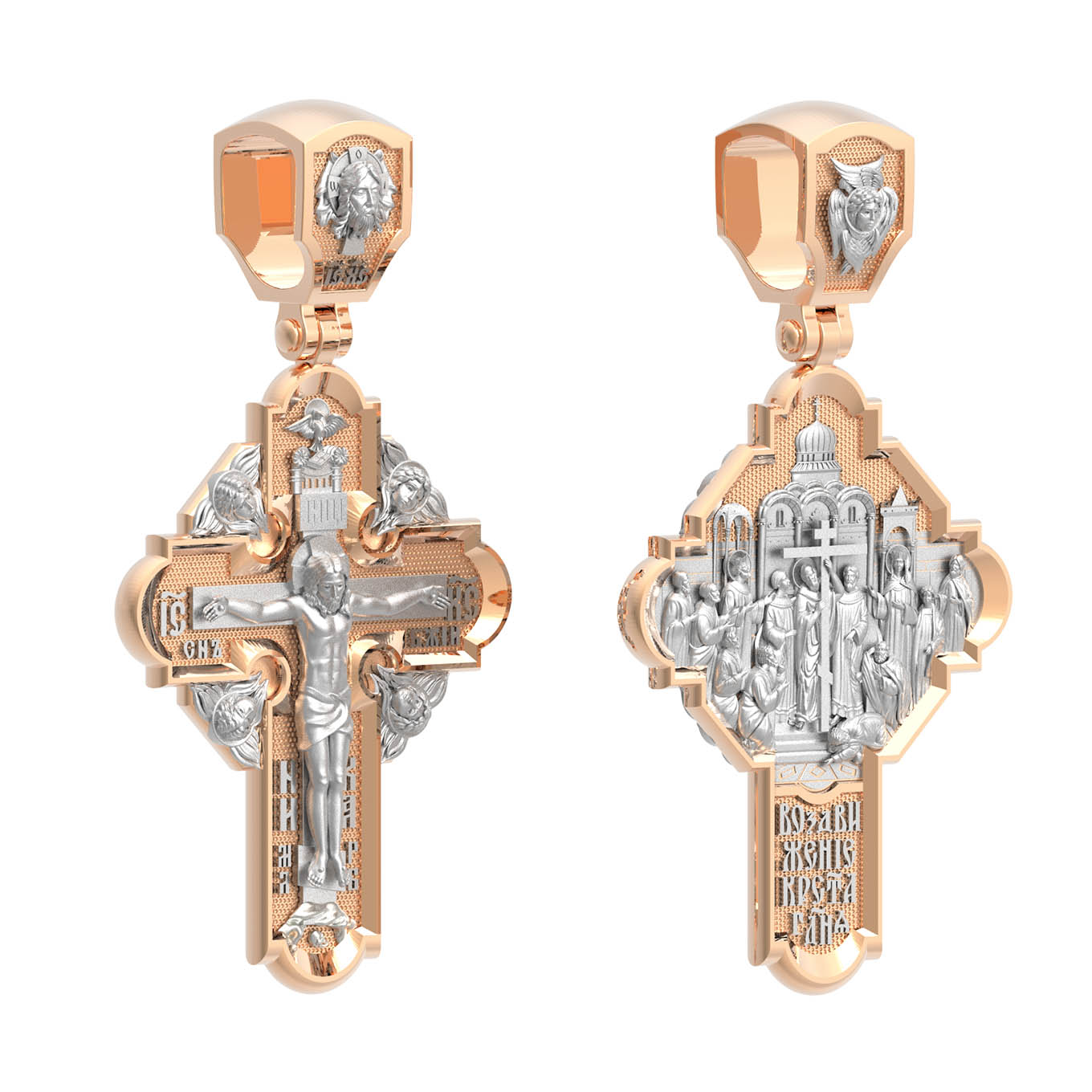 На оборотной стороне креста изображена икона Воздвижение Честного и Животворящего Креста Господня. Равноапостольный царь Константин пожелал построить храмы Божии на священных для христиан местах в Палестине и найти Крест, на котором был распят Спаситель. Исполнить желание царя взялась, с великою радостью, его мать, св. равноапостольная царица Елена. Крест был обретен в 326 году около горы Голгофы в Иерусалиме. C VII века с этим днём стали соединять память о возвращении Животворящего Креста из Персии византийским императором Ираклием (629). Праздник называется Воздвижением Креста, потому что и при обретении, и при возвращении Креста патриарх Макарий поднимал (Воздвигал) крест три раза, чтобы все могли его видеть. Народ же, видя Крест Спасителя, кланялся и восклицал: «Господи, помилуй!». Св. равноапостольные цари Константин и Елена, над местом страданий, погребения и воскресения Иисуса Христа построили обширный и великолепный храм в честь Воскресения Христова. На кулонном кольце изображен шестикрылый Ангел — Серафим.
