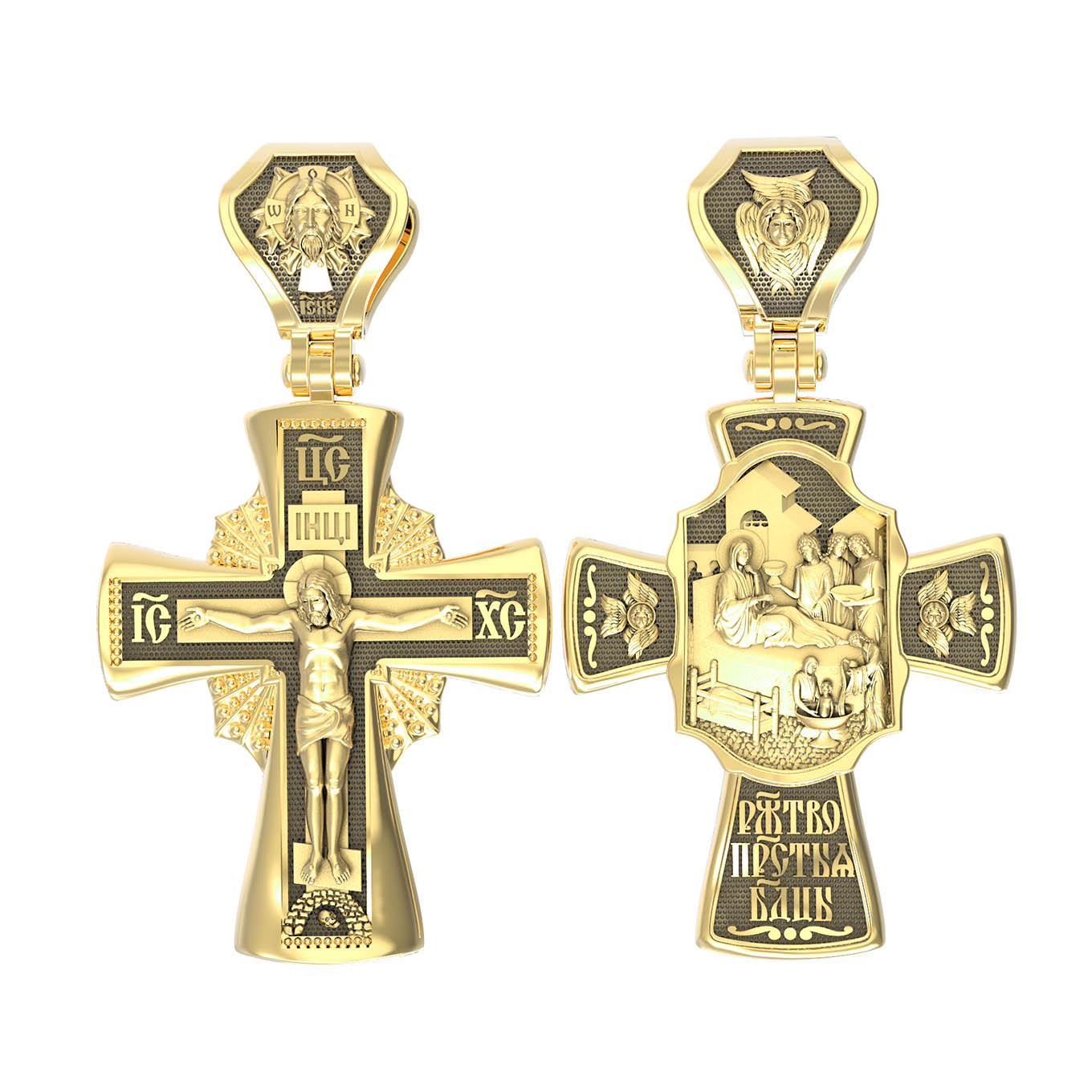 На оборотной стороне креста изображена икона Рождество Пресвятой Богородицы. Согласно церковному Преданию, Пресвятая Дева Мария родилась в небольшом галилейском городе Назарете. Родителями Её были праведные Иоаким и Анна. Супруги были бездетны, но не теряли надежды, что Господь может разрешить неплодство Анны даже в её преклонном возрасте. Они горячо молились и просили Господа даровать им дитя, которое обещали посвятить Богу для служения в храме. И Господь услышал их молитвы: Праведная Анна зачала и разрешилась дочерью Марией — будущей Пресвятой Богородицей. На кулонном кольце изображен шестикрылый Ангел — Серафим.