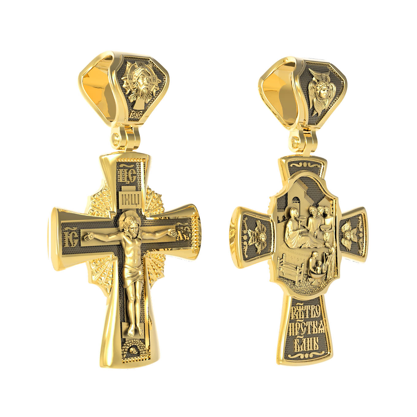 На лицевой стороне креста изображено Распятие Господа и Спасителя нашего Иисуса Христа, отдавшего Себя на смерть, для искупления грехов мира. Крест является символом жертвенной любви Всеблагого Бога к падшим людям, всепобеждающим духовным оружием христиан, основанием и средоточием церковной жизни. Господь сказал: кто хочет идти за Мною, отвергнись себя, и возьми крест свой, и следуй за Мною. (Мк. 8: 34). Над Распятием помещена надпись «Царь Славы». На верхней табличке, выше головы Иисуса, расположена надпись, составленная Понтием Пилатом — «IНЦI». Она означает «Иисус Назорей, Царь Иудейский». Надпись «IC» «ХC», означает Иисус Христос, помещается на разных сторонах поперечной перекладины креста. Возвышение, на котором стоит Крест, символизирует гору Голгофу, на которой произошло Распятие. Под подножием Креста изображена покоящаяся голова (череп) Адама. На кулонном кольце изображен Нерукотворный образ Господа и Спасителя нашего Иисуса Христа, чудесно отпечатавшийся на плате, которым Христос вытер свой лик. Ниже надпись — «IC» «ХC».