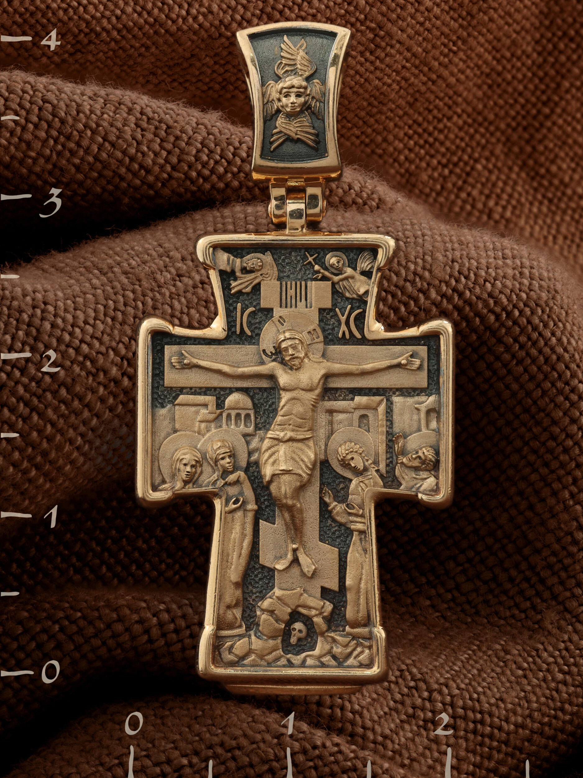 На лицевой стороне креста изображено Распятие Господа Иисуса Христа с предстоящими Ему святыми, которые, по преданию, находились у Креста Господа во время Его казни. Слева — Пресвятая Богородица и равноапостольная Мария Магдалина, справа — апостол Иоанн Богослов и мученик Лонгин Сотник. Верхняя перекладина креста символизирует титло — табличку, на которой, согласно Евангелию, было начертано: «Иисус Назорей Царь Иудейский» (IНЦI). Над перекладиной пишется сокращенно имя Спасителя «IC XC» — Иисус Христос. Возвышение, на котором стоит Крест, символизирует гору Голгофу, на которой произошло Распятие. У подножия Креста изображают прах Адама, обозначенный черепом.