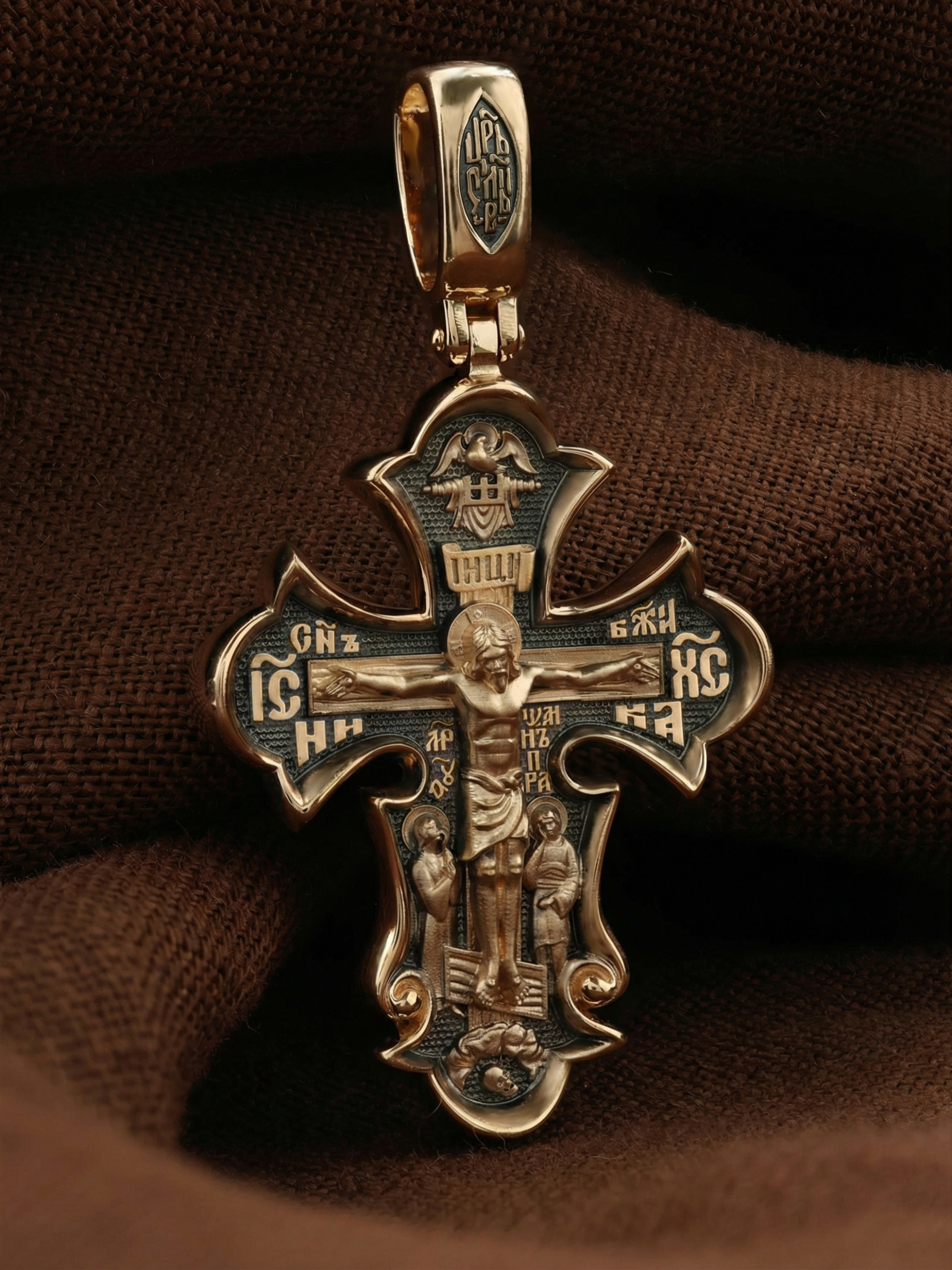 На лицевой стороне креста изображено Распятие Господа и Спасителя нашего Иисуса Христа, отдавшего Себя на смерть, для искупления грехов мира. Крест является символом жертвенной любви всеблагого Бога к падшим людям, всепобеждающим духовным оружием христиан, основанием и средоточием церковной жизни. Верхняя перекладина символизирует титло — табличку, на которой, согласно Евангелию, было начертано: Иисус Назорей Царь Иудейский (IНЦI). Также Распятие сопровождается надписями, олицетворяющими Христа. Надпись «IС» « ХС», что означает Иисус Христос, слово «НИКА», что означает «победитель» и слова «Сын Божий» помещается на разных сторонах поперечной перекладины креста. Над вершиной Распятия помещено изображение Святого Духа в виде голубя. Слева от Распятия изображена Пресвятая Богородица, справа — апостол и евангелист Иоанн Богослов, один из ближайших учеников Иисуса Христа. Возвышение, на котором стоит Крест, символизирует гору Голгофу, на которой произошло Распятие. Под подножием Креста изображена покоящаяся голова (череп) Адама. На кулонном кольце помещена надпись «Царь Славы».