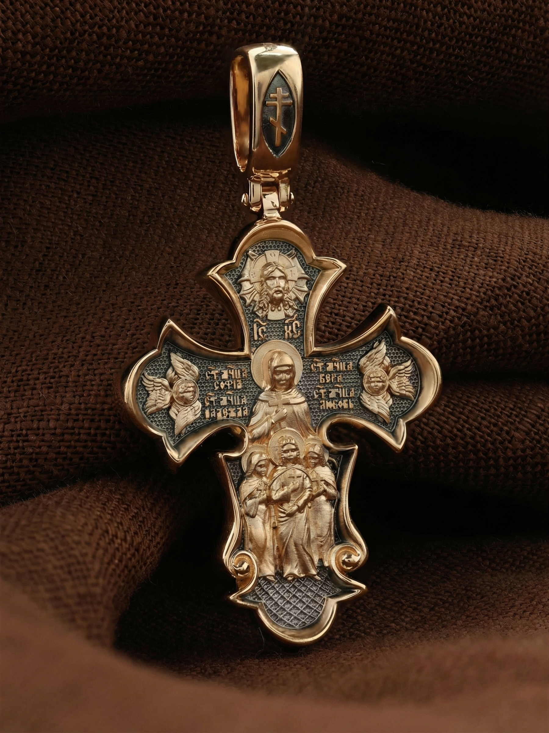 На оборотной стороне креста изображены Святые мученицы Вера, Надежда, Любовь и матерь их София, жившие во 2 веке нашей эры в Римской империи. Известно, что София была родом из Милана. Она рано овдовела, после чего перебралась в Рим. Своих дочерей София воспитывала в христианской вере и даже дала им имена в честь главных христианских добродетелей — Вера, Надежда и Любовь. В те годы римское государство жестоко преследовало верующих во Христа. Маленьких девочек (старшей Вере тогда было всего 12, а младшей Любови лишь 9) арестовали, подвергли истязаниям, а затем умертвили на глазах их матери. Сама София скончалась на следующий день у могилы своих дочерей. Но трагическая судьба на земле обернулась для мучениц вечной славой в ином мире. Церковь причислила их к лику святых и сегодня по молитвам к ним происходят чудеса. Выше образов мучениц изображен Спас Нерукотворный — образ Господа и Спасителя нашего Иисуса Христа, чудесно отпечатавшийся на плате, котором Христос вытер свой лик. По обеим сторонам креста изображены Ангелы Серафимы. На кулонном кольце помещен крест.