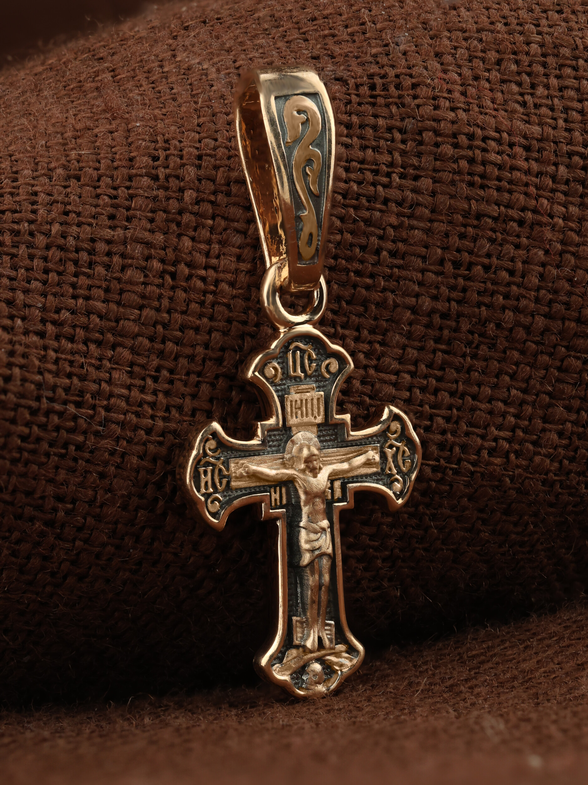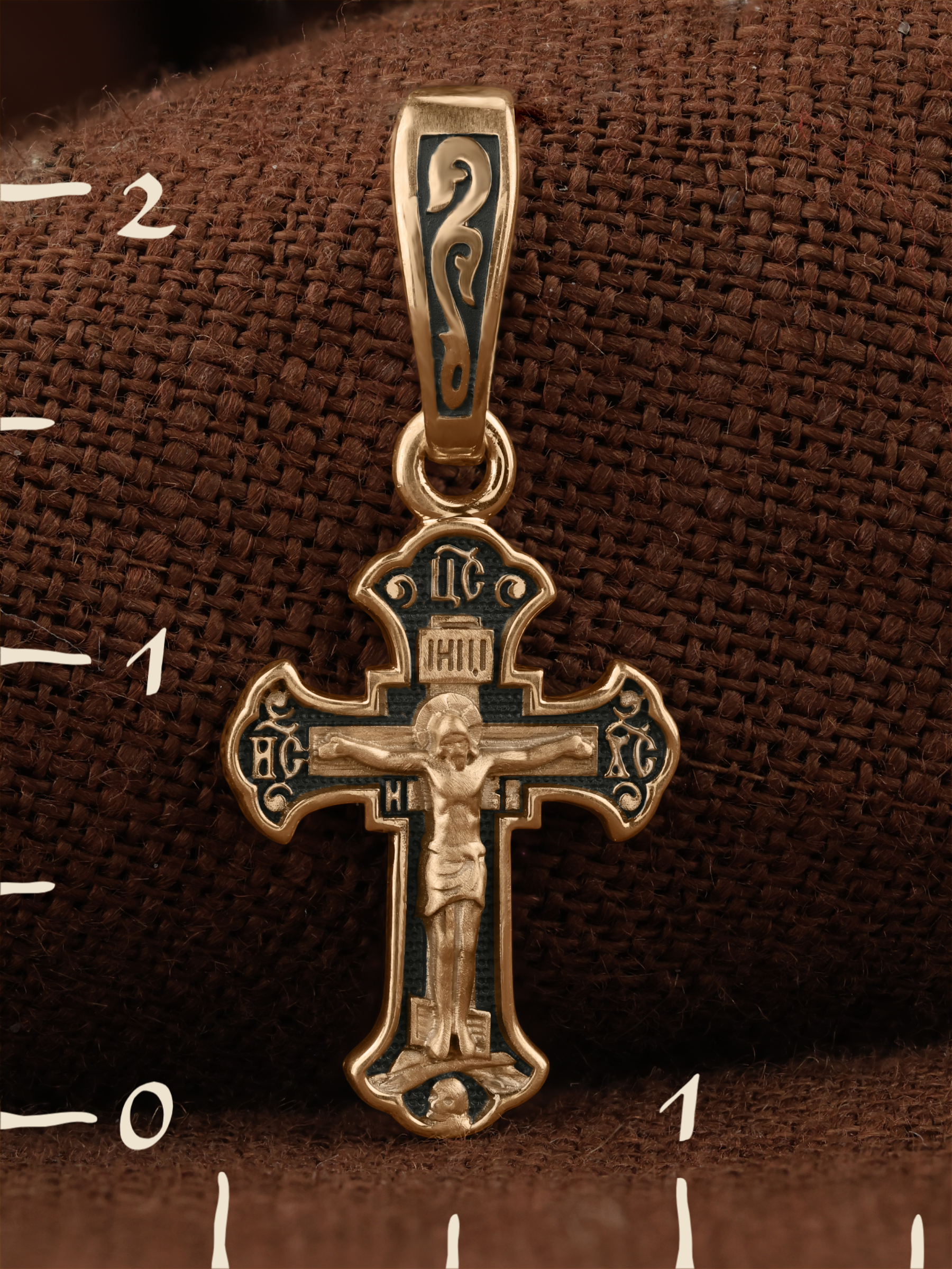 На лицевой стороне креста изображено Распятие Господа и Спасителя нашего Иисуса Христа, отдавшего Себя на смерть для искупления грехов мира. Крест является символом жертвенной любви Всеблагого Бога к падшим людям, всепобеждающим духовным оружием христиан, основанием и средоточием церковной жизни. Над вершиной Распятия помещена надпись «Царь Славы». На верхней перекладине расположена надпись «IНЦI». Она символизирует титло — табличку, на которой, согласно Евангелию, было начертано: Иисус Назорей, Царь Иудейский. Надпись «IC» «ХC»», означает Иисус Христос, помещаются на разных сторонах поперечной перекладины креста. Ниже помещена надпись «НИКА», что означает «победитель». Крест стоит на горе камней, символизирующих Голгофу. Под подножием Креста изображена покоящаяся голова (череп) Адама.