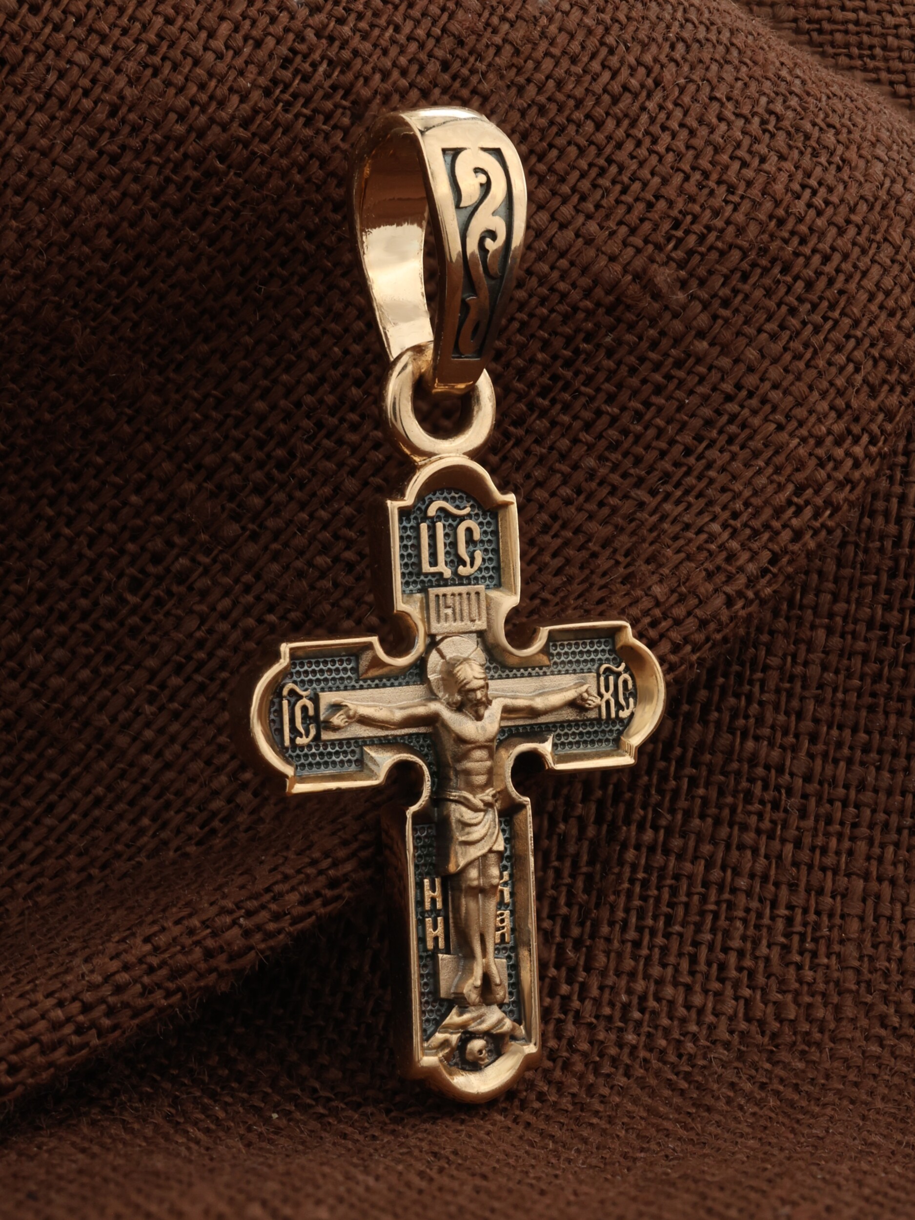 На лицевой стороне креста изображено Распятие Господа и Спасителя нашего Иисуса Христа, отдавшего Себя на смерть для искупления грехов мира. Крест является символом жертвенной любви Всеблагого Бога к падшим людям, всепобеждающим духовным оружием христиан, основанием и средоточием церковной жизни. Над вершиной Распятия помещена надпись «Царь Славы». На верхней перекладине расположена надпись «IНЦI». Она символизирует титло — табличку, на которой, согласно Евангелию, было начертано: Иисус Назорей, Царь Иудейский. Надпись «IC» «ХC»», означает Иисус Христос, помещаются на разных сторонах поперечной перекладины креста. Ниже помещена надпись «НИКА», что означает «победитель». Крест стоит на горе камней, символизирующих Голгофу. Под подножием Креста изображена покоящаяся голова (череп) Адама.