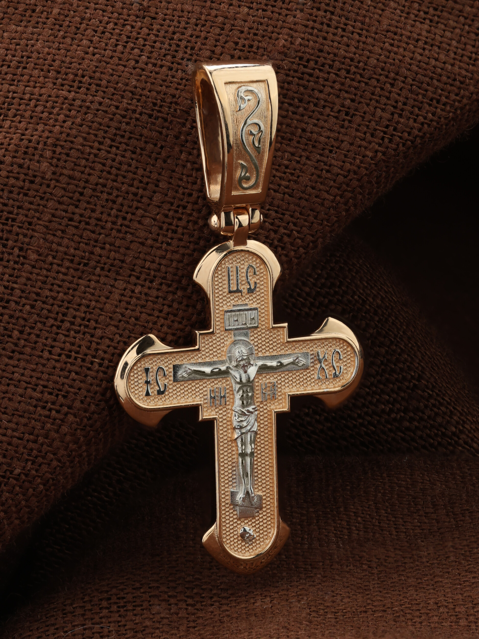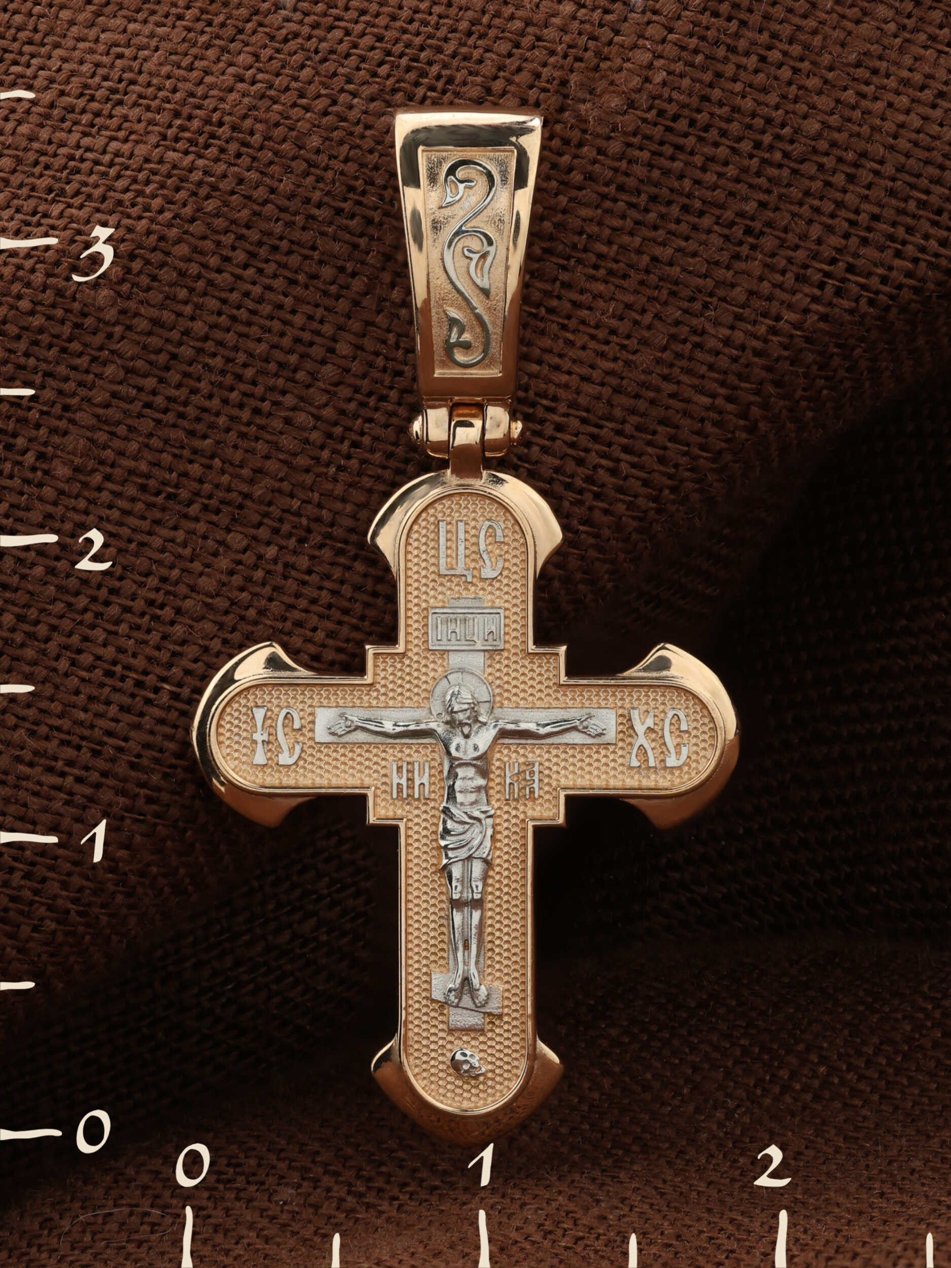 На лицевой стороне креста изображено Распятие, потому что это орудие казни Иисус Христос сделал орудием победы над грехом и смертью. Своими страданиями Он искупил грехи человечества, умерев и сошествовав во ад, победил сатану, освободил души праведников от вечной смерти и открыл им небесные врата рая. Жертва Христа сделала возможным спасение для каждого человека. На православном кресте Христос не умирает, а свободно простирает руки, ладони Иисуса открыты, будто он хочет обнять все человечество, даря им свою любовь и открывая путь к вечной жизни. Над титлом видим слова «ЦРЬ СЛВЫ» — Царь Славы. Верхняя перекладина символизирует собой табличку с надписью «IHЦI» — Иисус Назарянин Царь Иудейский. Возле перекладины пишется сокращенно имя Спасителя «IC XC» — Иисус Христос, ниже добавляется «НИКА» (греч. — Победитель). Возвышение, на котором стоит Крест, символизирует гору Голгофу, на которой произошло Распятие. У подножия Креста изображают прах Адама, обозначенный черепом.
