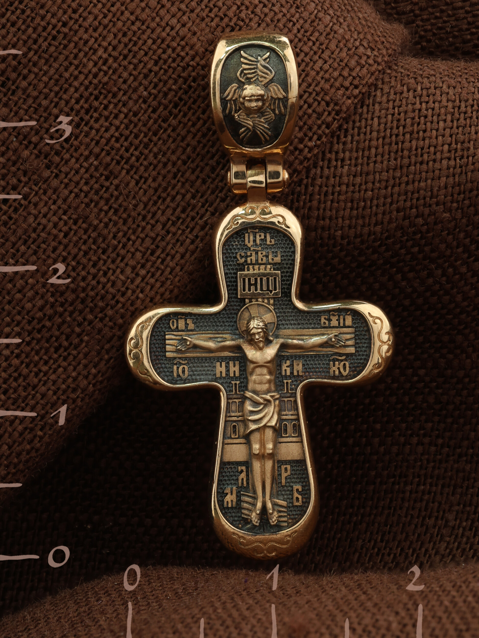 На обороте креста изображена икона Покрова Пресвятой Богородицы. Праздник Покрова Божией Матери является воспоминанием чуда, которое произошло во Влахнернской церкви 1 (14) октября 910 года: Пресвятая Богородица явилась верующим над алтарем храма и распростерла над ними Свое покрывало. В этот день Божья Матерь открыла людям, что Она является Ходатаицей за них перед Богом. Богородица простирает Свой молитвенный покров над всеми православными христианами и умоляет Сына Своего о даровании вечного спасения каждому человеку. На кулонном кольце изображен Спас Нерукотворный — Символ вочеловечившегося Божества и шестикрылый Серафим — самый приближенный к Господу Ангел.