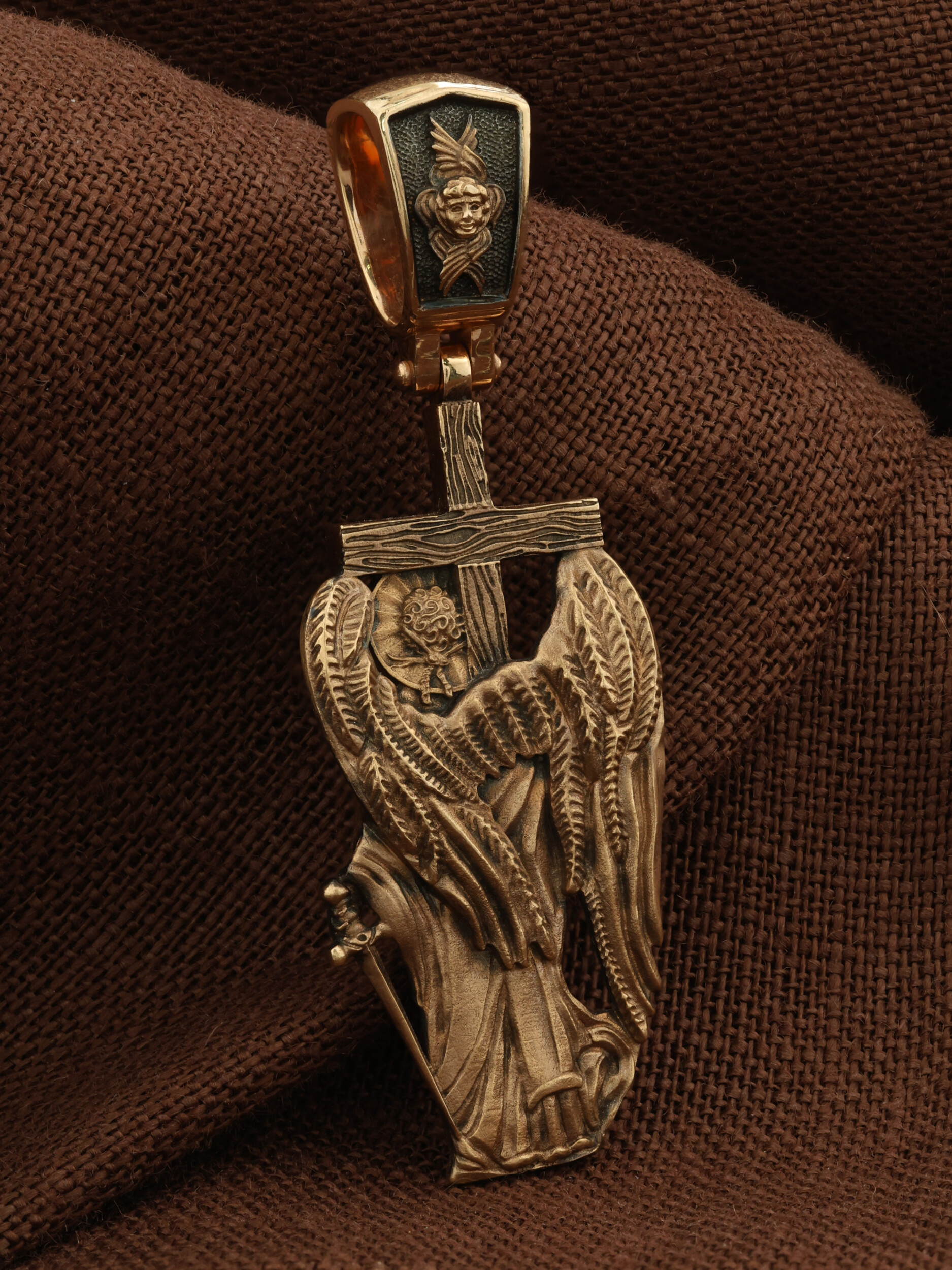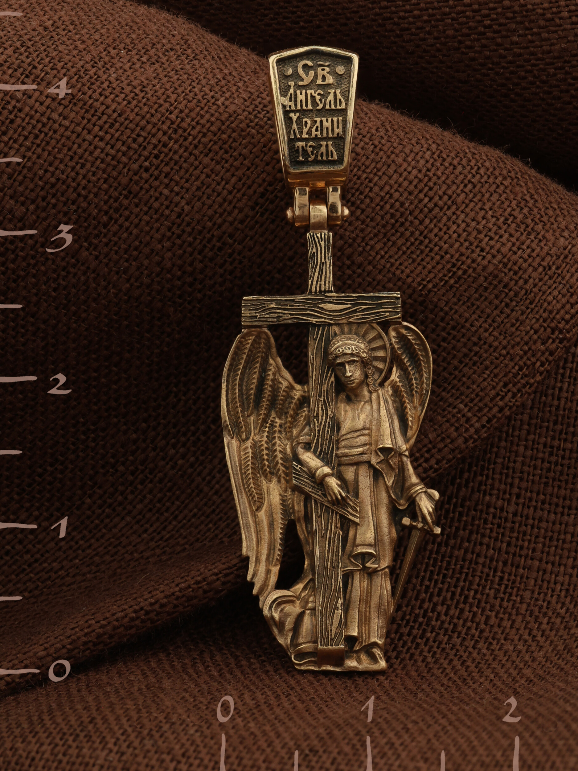 Основой композиции является изображение Святого Ангела-Хранителя держащего в правой руке крест, а в левой — мечь. Крест является символом жертвенной любви всеблагого Бога к падшим людям, всепобеждающим духовным оружием христиан, основанием и средоточием церковной жизни. Господь сказал: «кто хочет идти за Мною, отвергнись себя, и возьми крест свой, и следуй за Мною». (Мк. 8: 34). Ангел-Хранитель — это Ангел приставляемый Богом к человеку при крещении для охраны и помощи в добрых делах. Он невидимо находится при человеке на протяжении всей его жизни, если человек сохраняет в себе любовь к Богу и истинную веру перед Ним. Ангел-Xранитель делают для нас все, что служит к истинному нашему благу и спасению. Невидимо пребывая при нас постоянно, он, руководствуя нас ко спасению, не только по нашему желанию таинственно наставляет нас на все доброе и полезное, не только возносит наши молитвы к Богу, но еще и сам от себя охраняют и защищают нас от врагов видимых и невидимых и ходатайствует за нас пред Богом. Ангел-Хранитель так любит нас, как никто на земле любить не может. Ангел-Хранитель — присный друг наш, незримый тихий собеседник, пресладостный утешитель.