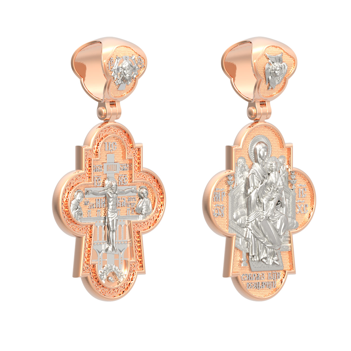 На лицевой стороне креста изображено Распятие Господа и Спасителя нашего Иисуса Христа, отдавшего Себя на смерть, чтобы другие могли жить — жить вечной жизнью, жить с Богом. Через крестную жертву Бог раскрывает нам Свою безмерную любовь и призывает к ответной любви. Своею кровью Господь освятил крест и сделал его проводником Своей благодати, источником освящения верующих. На верхней табличке, выше головы Иисуса, расположена надпись, составленная Понтием Пилатом — «IНЦI». Она означает «Иисус Назорей, Царь Иудейский». Распятие сопровождается каноническими надписями. Над Распятием находится надпись «Царь Славы». Надпись «IС» « ХС» означает Иисус Христос и помещается на разных сторонах поперечной (большой) перекладины креста. Рядом расположены надпись «Сын Божий» и слово «НИКА», что означает «победитель». Слева от Распятия изображена Пресвятая Богородица, справа — апостол и евангелист Иоанн Богослов, один из ближайших учеников Иисуса Христа. За Распятием высится Иерусалимская стена, в знак того, что Господь был распят вне стен города. Возвышение, на котором стоит Крест, символизирует гору Голгофу, на которой произошло Распятие. Под подножием Креста изображена покоящаяся голова (череп) Адама. Над На кулонном кольце изображен Нерукотворный образ Господа и Спасителя нашего Иисуса Христа, чудесно отпечатавшийся на плате, котором Христос вытер свой лик.
