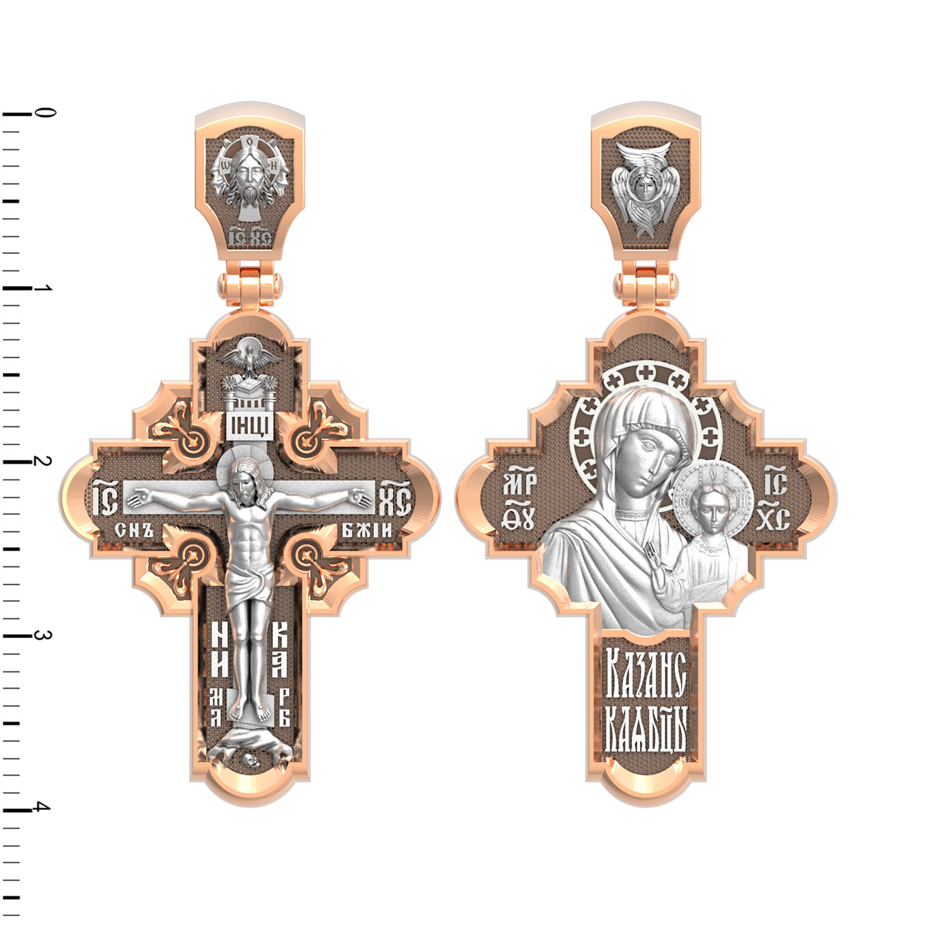 На оборотной стороне креста изображена Казанская икона Божией Матери. Пресвятая Богородица — милосердная заступница, просительница за нас перед Богом. Она стала воистину нашей Матушкой, охраняющей и поддерживающей нас от рождения до самой смерти, а Ее благодатная помощь изливается на нас по молитвам у ее чудотворных икон. Казанская икона явилась в 1579 году в Казани, вскоре после взятия Казанского царства у татар Иоанном Грозным. Этот образ Богородицы не раз сопровождал русский народ в бедствиях. Икона Божией Матери Казанская вдохновляла русских ратников в период Смутного времени при освобождении Москвы от поляков. Перед Казанской иконой в 1709 году, накануне Полтавской победы, император Петр I молился о даровании победы русскому войску. В 1812 году накануне отъезда в действующую армию перед чудотворной иконой Божией Матери молился князь Михаил Кутузов. Не только государственным мужам и дружинам указывала путь икона — по доброй традиции именно этой иконой благословляют на брак молодых родители, длинным списком чудес сопровождается этот образ Богоматери — один из самых любимых на Руси. Существует множество древних списков с этой удивительной иконы.