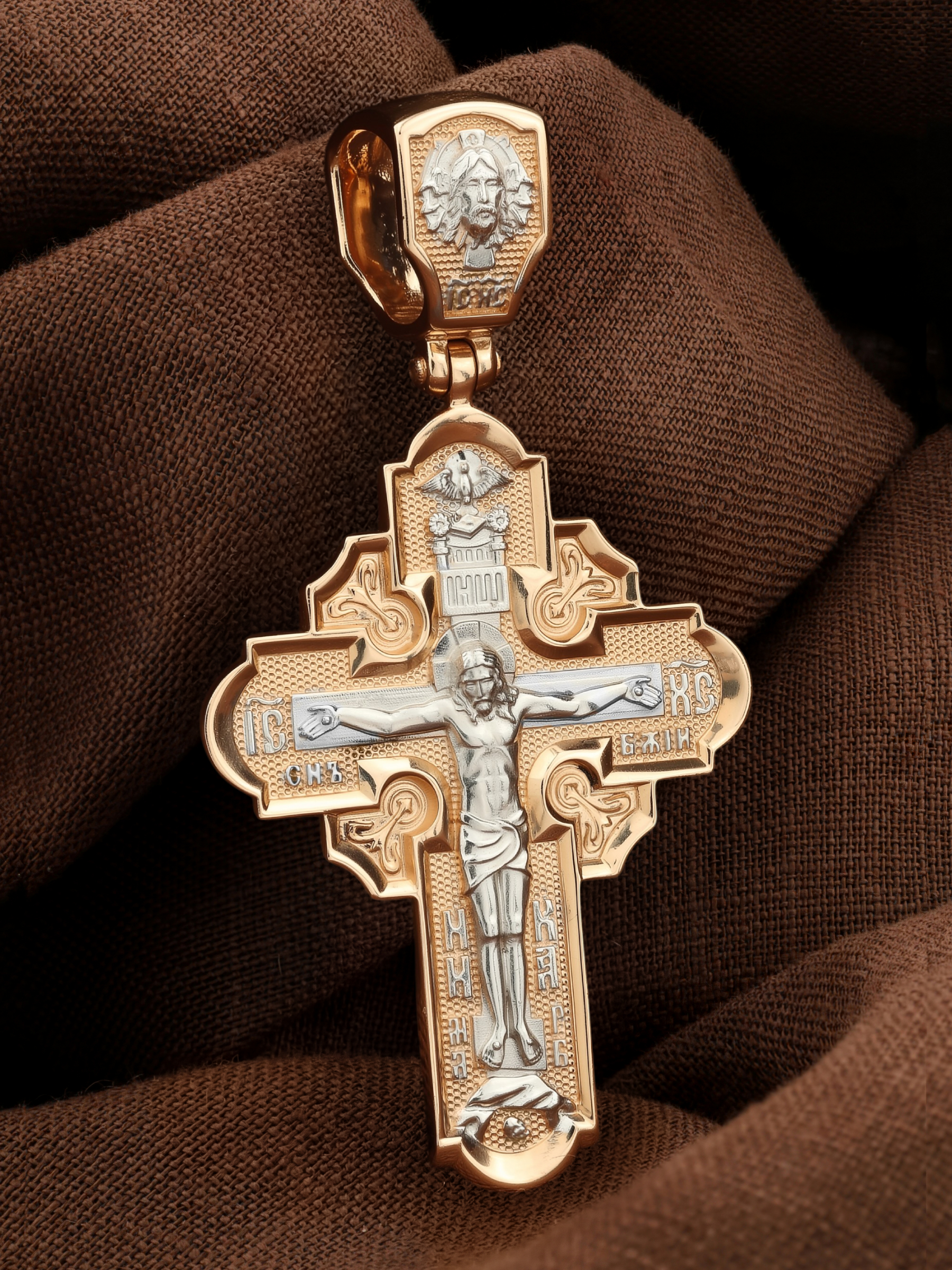 На лицевой стороне креста изображено Распятие Господа и Спасителя нашего Иисуса Христа, отдавшего Себя на смерть, чтобы другие могли жить — жить вечной жизнью, жить с Богом. Своею кровью Господь освятил крест и сделал его проводником Своей благодати, источником освящения верующих. На верхней табличке, выше головы Иисуса, расположена надпись, составленная Понтием Пилатом — «ИНЦИ». Она означает «Иисус Назорей, Царь Иудейский». Надпись «IС ХС» означает Иисус Христос помещается на разных сторонах поперечной (большой) перекладины креста. На кулонном кольце помещено изображение Духа Святого в виде голубя, сходящего с Небес