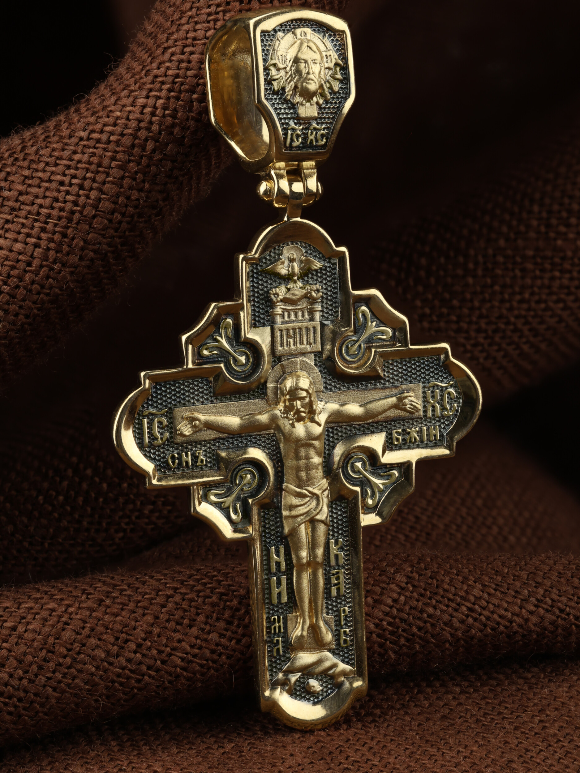 На лицевой стороне креста изображено Распятие Господа и Спасителя нашего Иисуса Христа, отдавшего Себя на смерть, чтобы другие могли жить — жить вечной жизнью, жить с Богом. Своею кровью Господь освятил крест и сделал его проводником Своей благодати, источником освящения верующих. На верхней табличке, выше головы Иисуса, расположена надпись, составленная Понтием Пилатом — «ИНЦИ». Она означает «Иисус Назорей, Царь Иудейский». Надпись «IС ХС» означает Иисус Христос помещается на разных сторонах поперечной (большой) перекладины креста. На кулонном кольце помещено изображение Духа Святого в виде голубя, сходящего с Небес