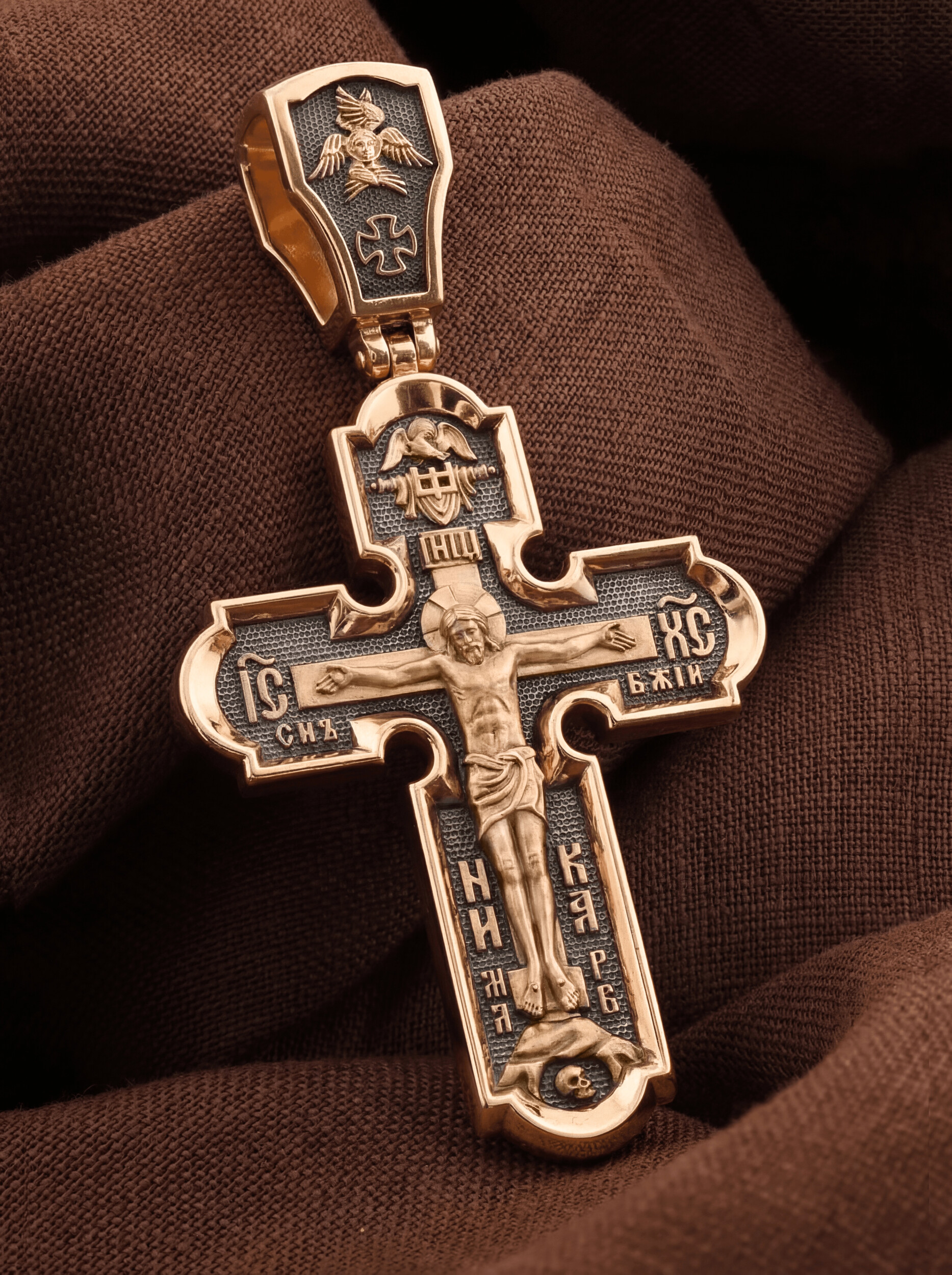 На лицевой стороне креста изображено Распятие Господа и Спасителя нашего Иисуса Христа. Христос, подвергнутый на кресте мучительной казни, своими страданиями искупил нас от древнего греха и даровал нам жизнь вечную. Без Распятия не было бы Воскресения Христова, и поэтому Крест из орудия казни обратился в святыню, в которой действует Благодать Божия. Над Распятием изображен Дух Святой в виде голубя, сходящего с Небес. Распятие сопровождается каноническими надписями. На верхней табличке, выше головы Иисуса, расположена надпись, составленная Понтием Пилатом на трех языках — «IНЦI». Она означает «Иисус Назорей, Царь Иудейский». Надпись «IС ХС» означает Иисус Христос и помещается на разных сторонах поперечной (большой) перекладины креста. Ниже — словосочетание «СЫН БОЖИЙ», что означает божественную природу Иисуса Христа. Крест стоит на горе камней, символизирующих Голгофу. В ее основании различается череп — это голова Адама. Надписи «Ника», что означает Победитель, и надпись «МЛРБ» — «место лобное рай бысть», что означает место лобное стало раем, размещены в нижней части креста. На кулонном кольце изображен шестикрылый Серафим.