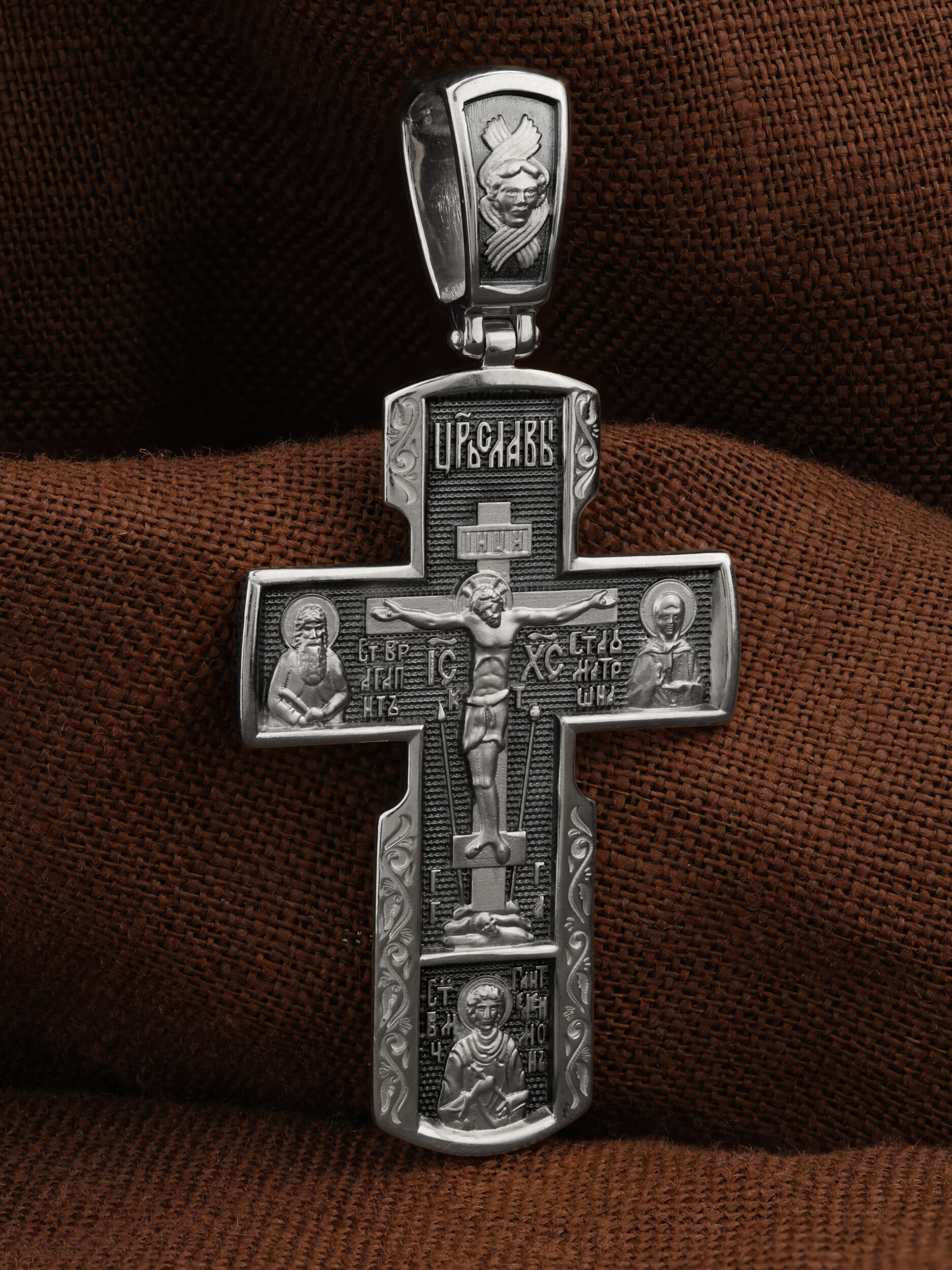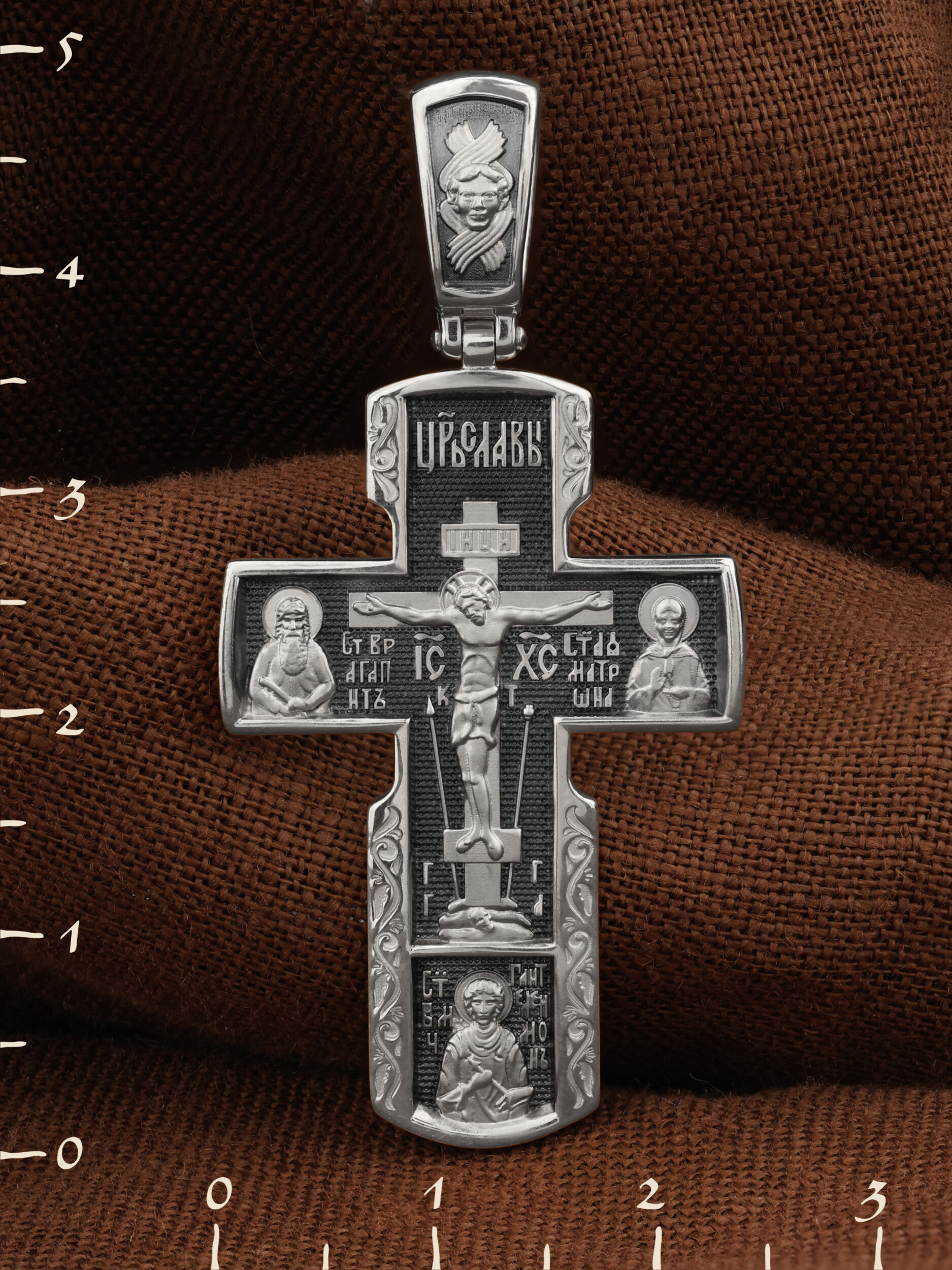 Как действенная помощь в немощах и болезнях был создан крест с образами святых целителей и со знаменитой афонской иконой Божией Матери «Всецарица». Над титлом видим слова «ЦРЬ СЛВЫ» — Царь Славы. Верхняя перекладина символизирует собой табличку с надписью «IHЦI» — Иисус Назарянин Царь Иудейский. Под перекладиной пишется сокращенно имя Спасителя «IC XC» — Иисус Христос. Возвышение, на котором стоит Крест, символизирует гору Голгофу, на которой произошло Распятие. У подножия Креста изображают прах Адама, обозначенный черепом. Справа от Распятия помещен образ прославленной святой блаженной Матроны. Слева — икона преподобный Агапита. Этот святой жил в пещерах Киево-Печерского монастыря в XI веке и бескорыстно врачевал мирян и монахов. У основания Креста Господня изображен великомученик Пантелеимон Целитель. Господь даровал удивительную силу его молитве. Ею он исцелял любые болезни и даже воскрешал умерших.