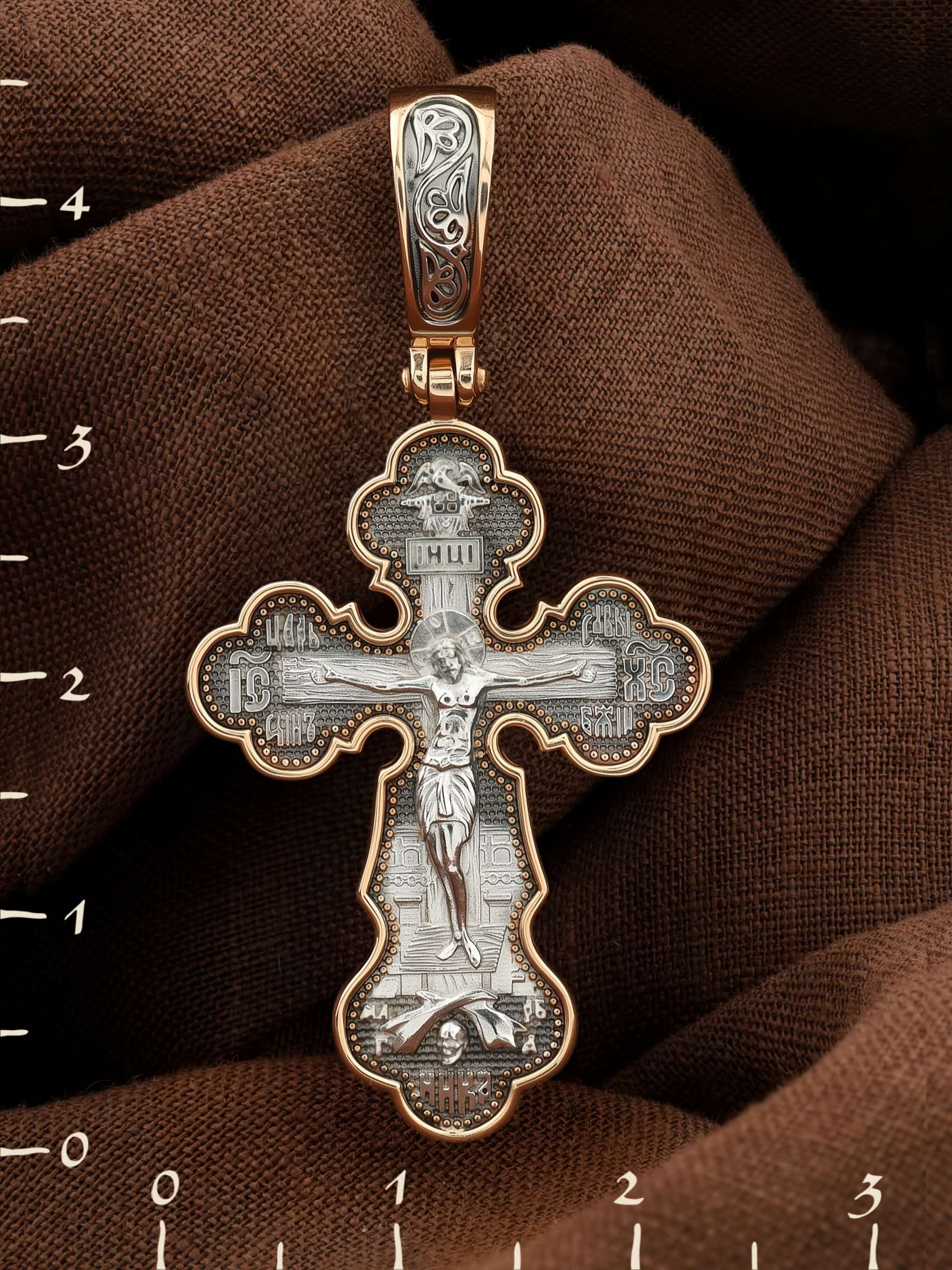 На лицевой стороне креста изображено Распятие Господа и Спасителя нашего Иисуса Христа. Христос, подвергнутый на кресте мучительной казни, своими страданиями искупил нас от древнего греха и даровал нам жизнь вечную. На верхней табличке, выше головы Иисуса, расположена надпись, составленная Понтием Пилатом — «IНЦI». Она означает «Иисус Назорей, Царь Иудейский». Распятие сопровождается каноническими надписями. Надпись «IС ХС» означает Иисус Христос, надпись «Царь Славы» и словосочетание «СЫН БОЖИЙ», что означает божественную природу Иисуса Христа, помещаются на разных сторонах поперечной перекладины креста. В нижней части креста находятся надписи –«НИКА» и «МЛРБ». В переводе с греческого, слово «НИКА» означает «победитель». Именно оно является символом победы Христа над смертью. Надпись «МЛРБ» — «место лобное рай бысть» означает, что место лобное стало раем. Крест стоит на горе камней, символизирующих Голгофу. Под подножием Креста изображена покоящаяся голова (череп) Адама и надпись «Г.А.». Христос в Своей Божественной любви, над которой смерть не властна и которая, страдая, и не страдает в обычном смысле, простирает к людям со Креста Свои объятия, в которые призывается и привлекается весь мир. Поэтому Тело Его не висит, а торжественно покоится на Кресте.