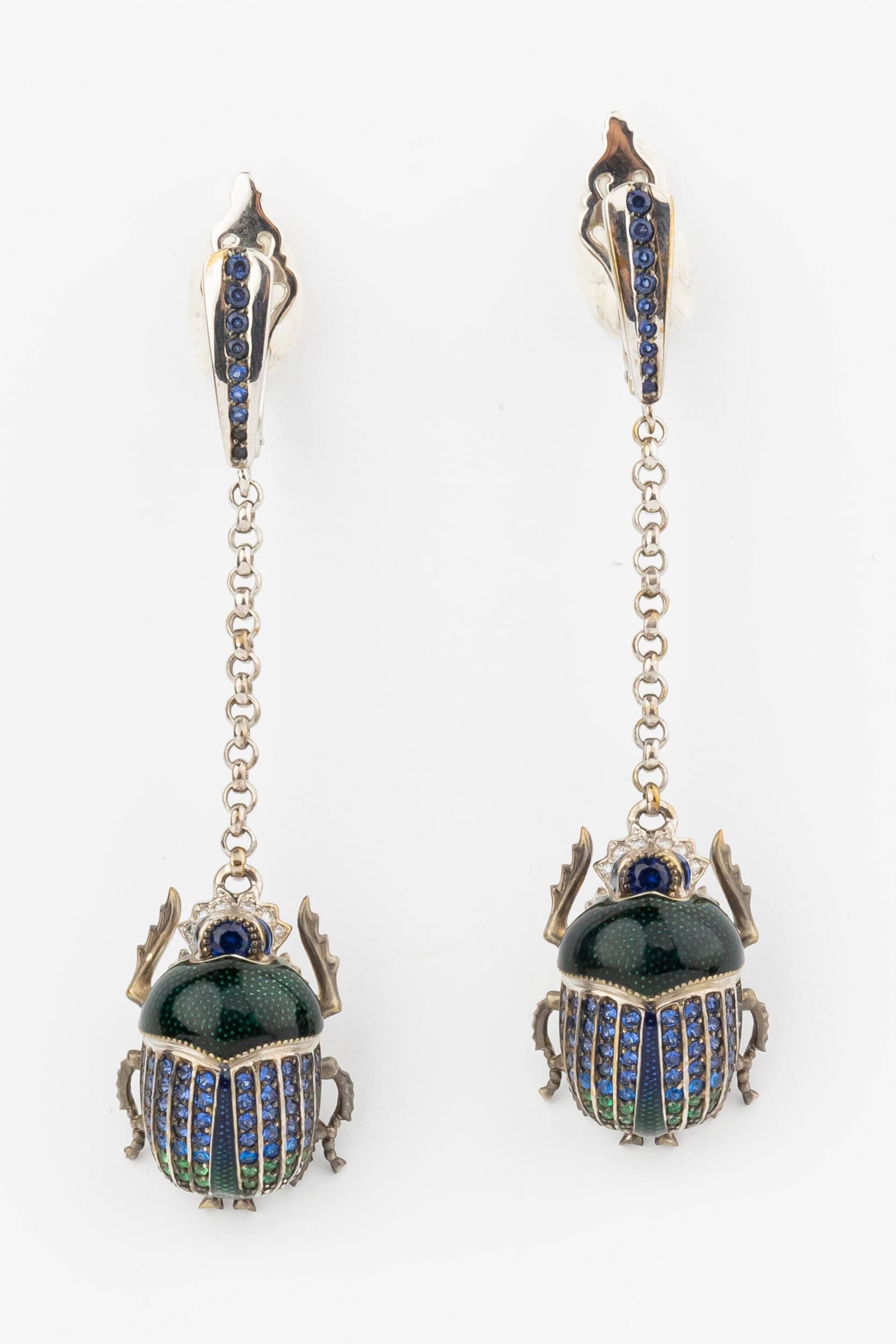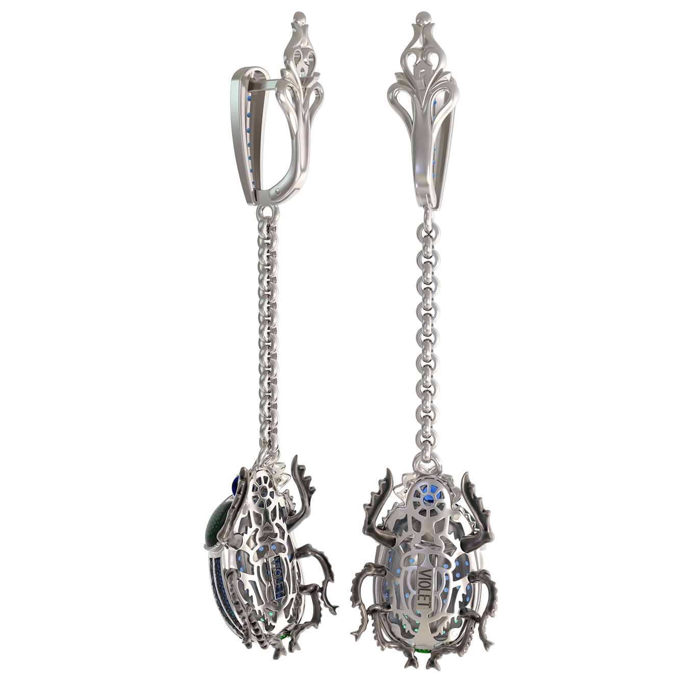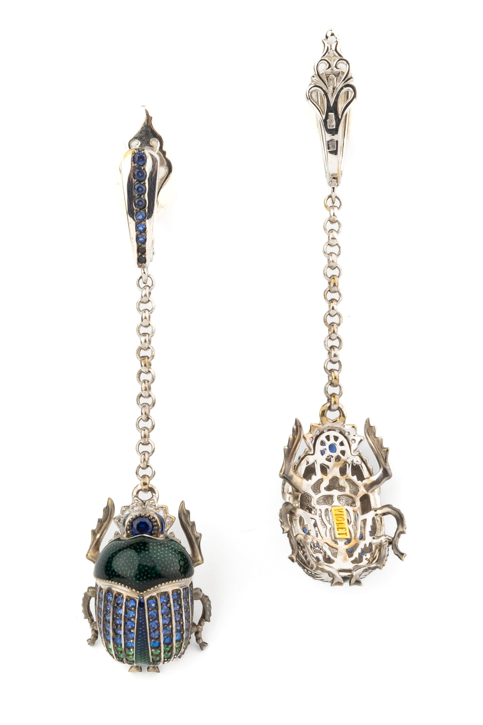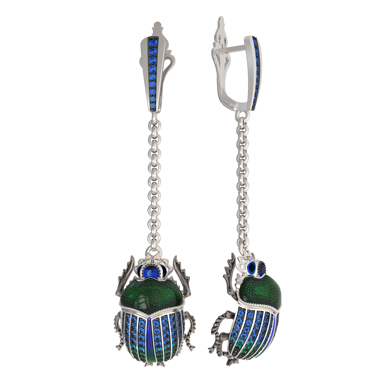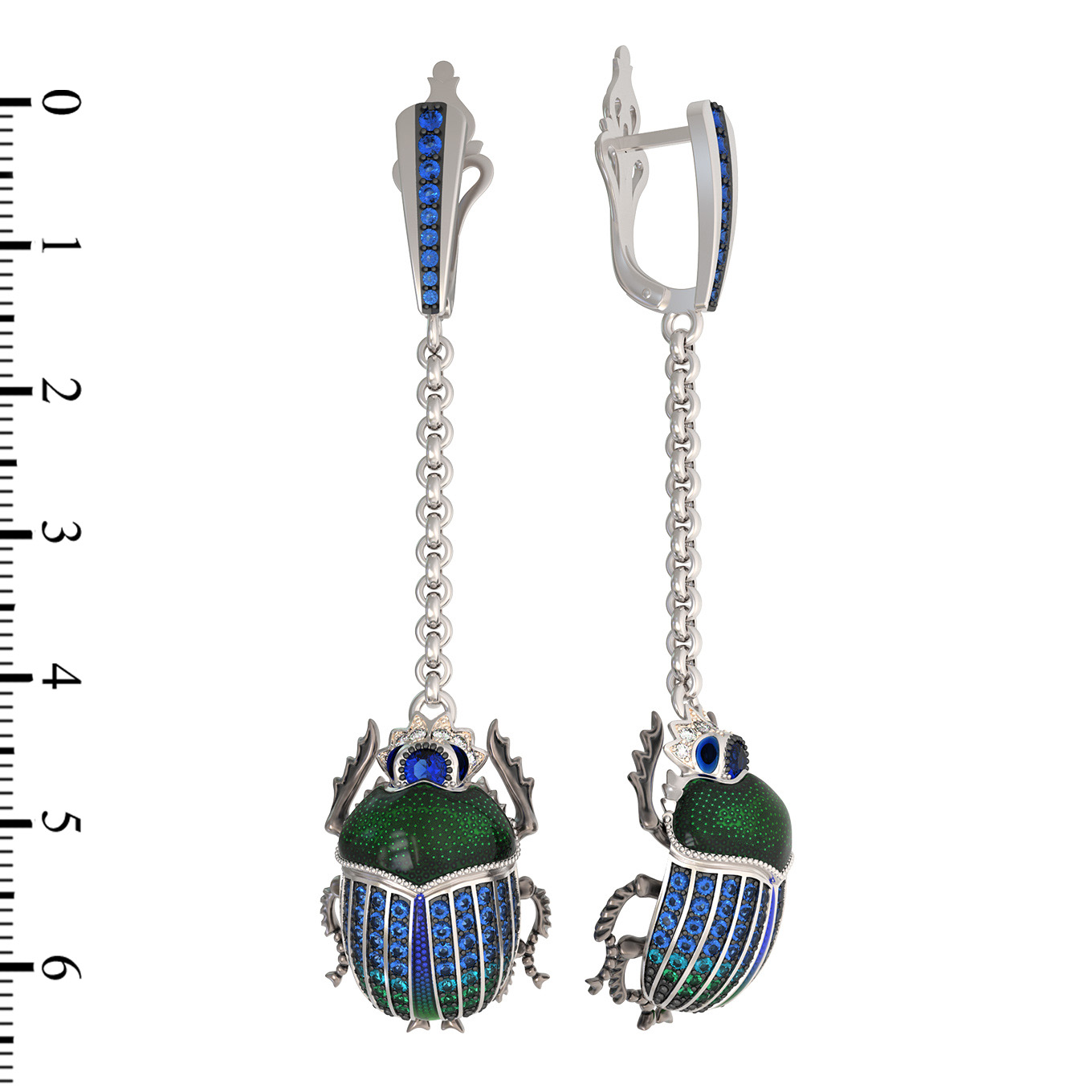 Серьги из белого золота c эмалью, фианитом и сапфиром