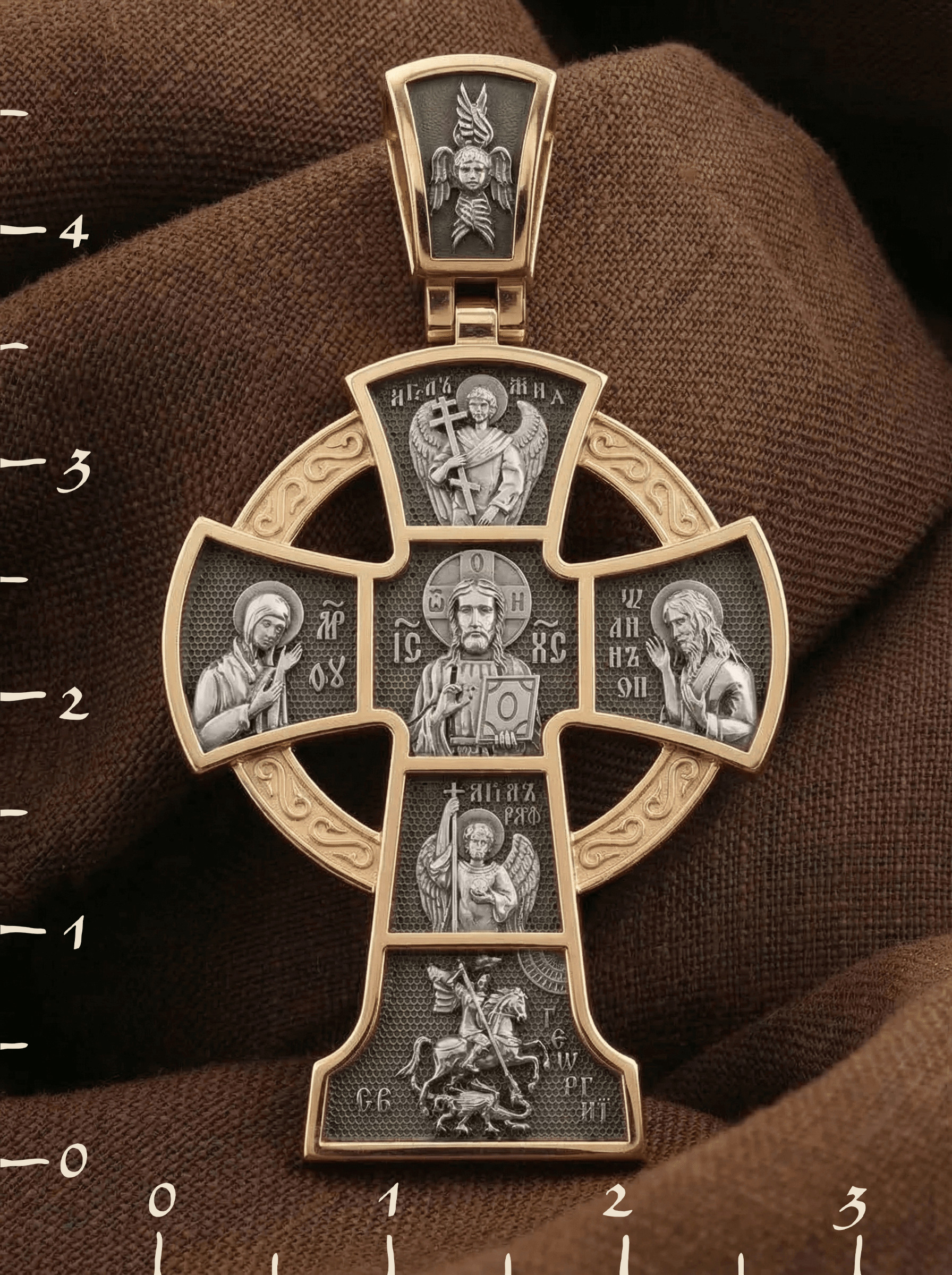 Вверху и внизу от спасителя предстоят два архангела, Михаил (Первый служитель Божественной славы, страж и защитник) и Гавриил (служитель Божественной крепости и изъявитель сокровенных Божьих тайн). Внизу помещен образ свт. Георгия Победоносца. Святой при жизни прославился не только как храбрый воин и твердый исповедник веры, но и как сострадательный, милосердный целитель и чудотворец. Святому молятся о покровительстве воинам и армии, о защите государства, сохранении и спасения России.