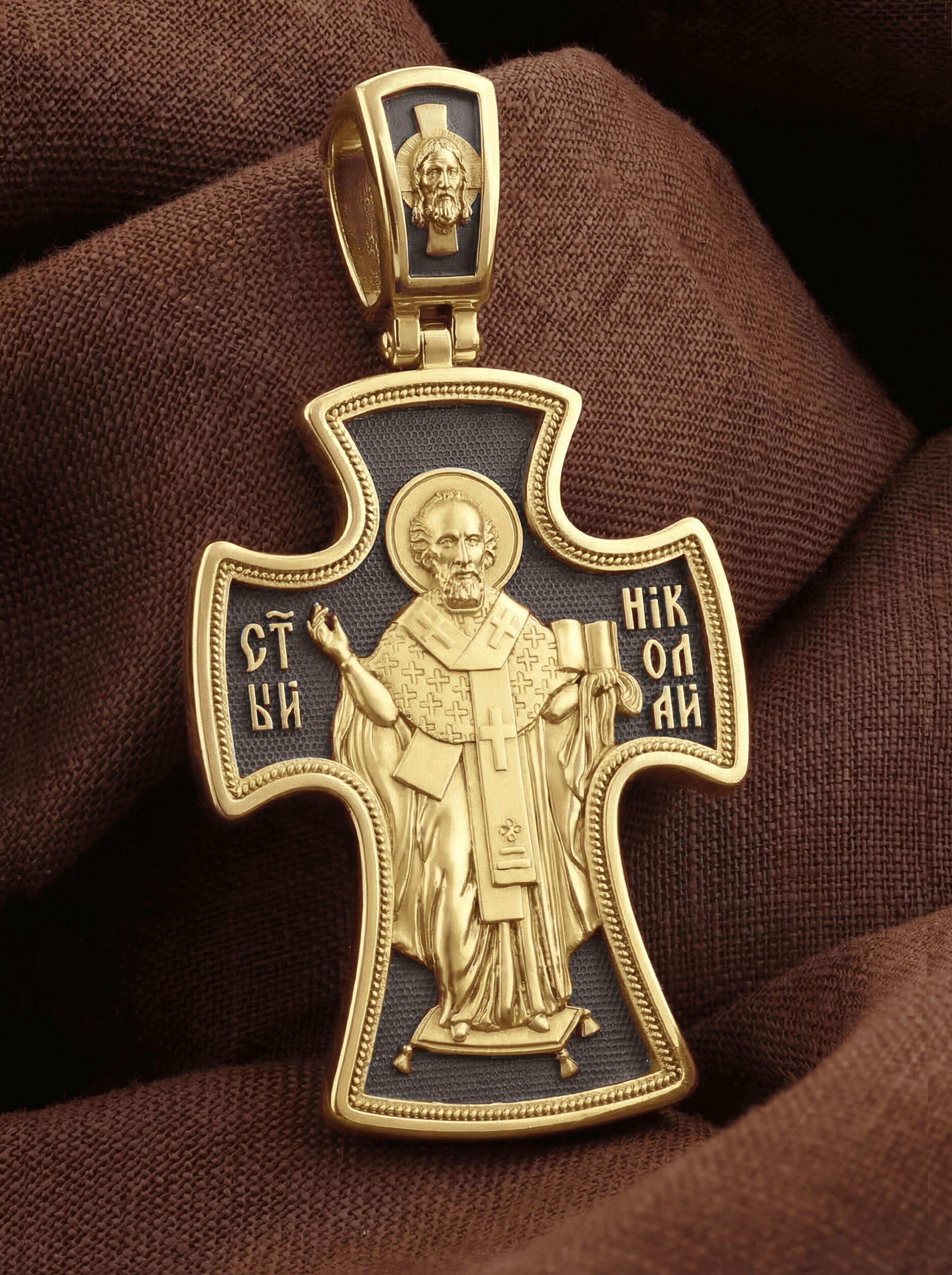 Оборотную сторону креста возглавляет икона святителя Николая Чудотворца, которого еще называют Николай Угодник за то, что он угодил своей жизнью Богу. Николай Чудотворец, помощник в делах, покровитель учащихся, утешитель обиженных. Также Святитель Николай Чудотворец известен своими молитвами за путешественников, когда непрестанный ветер и бушующие волны утихают и корабль заходит в спокойную гавань. На кулонном кольце изображен Спас Нерукотворный — Символ вочеловечившегося Божества и четырехкрылый Херувим.