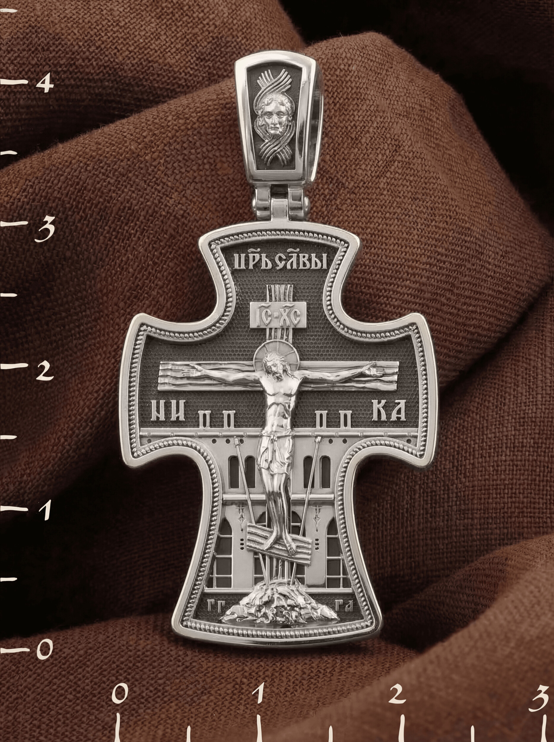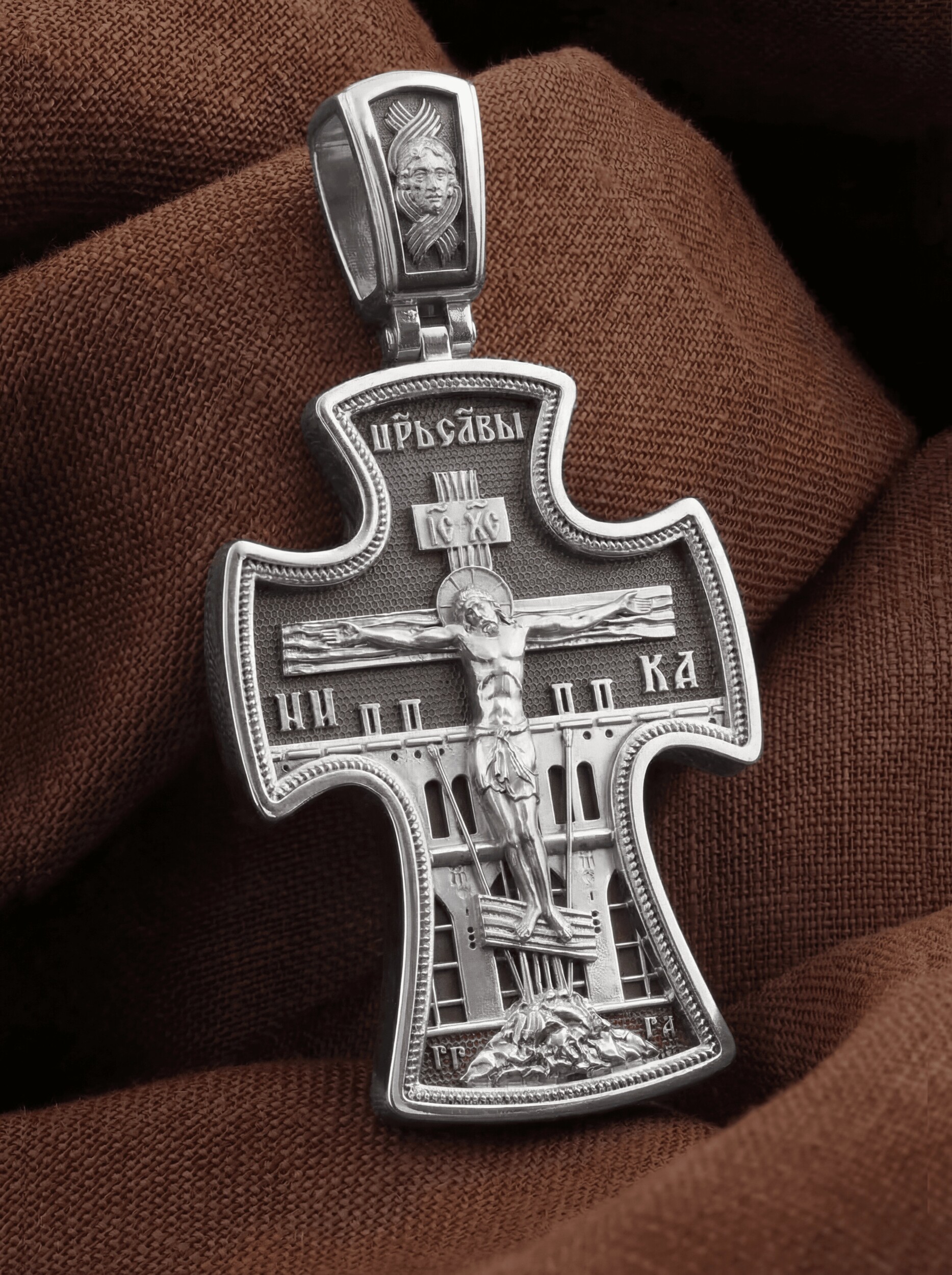 На лицевой стороне креста изображено Распятие, потому что это орудие казни Иисус Христос сделал орудием победы над грехом и смертью. Своими страданиями Он искупил грехи человечества, умерев и сошествовав во ад, победил сатану, освободил души праведников от вечной смерти и открыл им небесные врата рая. Жертва Христа сделала возможным спасение для каждого человека. На православном кресте Христос не умирает, а свободно простирает руки, ладони Иисуса открыты, будто он хочет обнять все человечество, даря им свою любовь и открывая путь к вечной жизни. Над титлом видим слова «ЦРЬ СЛВЫ» — Царь Славы. Верхняя перекладина символизирует собой табличку с надписью «IC XC» — Иисус Христос, ниже перекладины добавляется: «НИКА» (греч. — Победитель). Возвышение, на котором стоит Крест, символизирует гору Голгофу, на которой произошло Распятие. У подножия Креста изображают прах Адама, обозначенный черепом. По сторонам Голгофы начертаны буквы «ГГ» (Гора Голгофа) и «ГА» (голова Адама). Справа и слева от Креста изображены орудия страданий Господа — трость и копие, обозначенные буквами «Т» и «К».