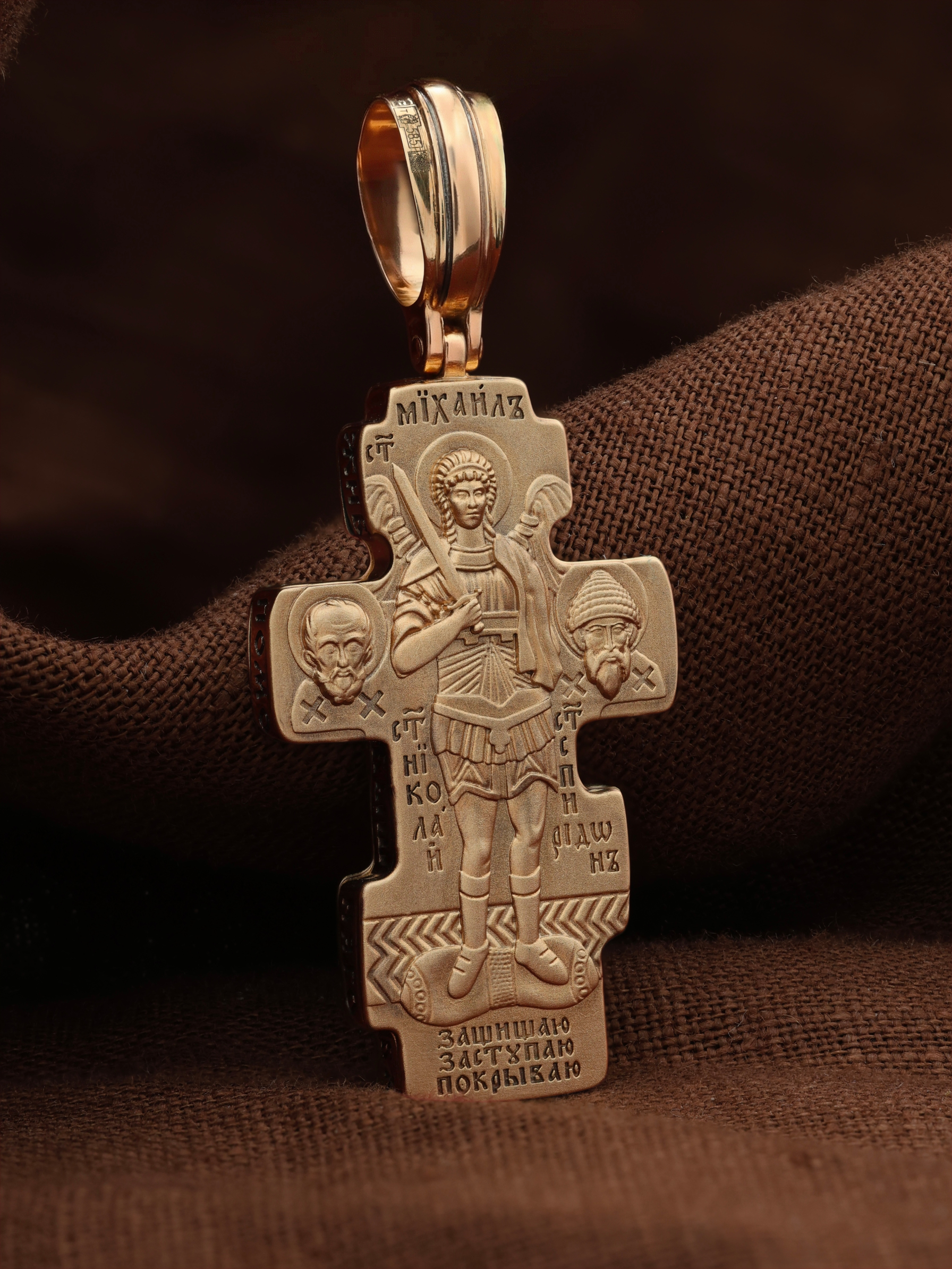 Центральную часть оборотной стороны креста занимает изображение Архангела Михаила — верного служителя Божия, который низринул с Неба возгордившегося денницу с другими павшими духами. В Православии его называют Архистратигом, что означает глава святого воинства Ангелов и Архангелов. Архангел Михаил изображен в воинственном виде с огненным мечом в правой руке. Архангел почитается как покровитель воинов и всех верных Богу и ведущих борьбу против сил зла, борец против ересей, а также защитник душ умерших, страж райских врат. С древних времен прославлен своими чудесами Архангел Михаил на Руси. Слева от образа Архангела изображен Святитель Николай Чудотворец, архиепископ Мир Ликийских, справа — Святитель Спиридон Тримифутский Чудотворец. Святители являются одними из самых почитаемых святых в православном мире. На торцевой стороне креста размещены слова молитвы из 90-го псалма: «Живый в помощи Вышняго, в крове Бога Небеснаго водворится. Речет…»