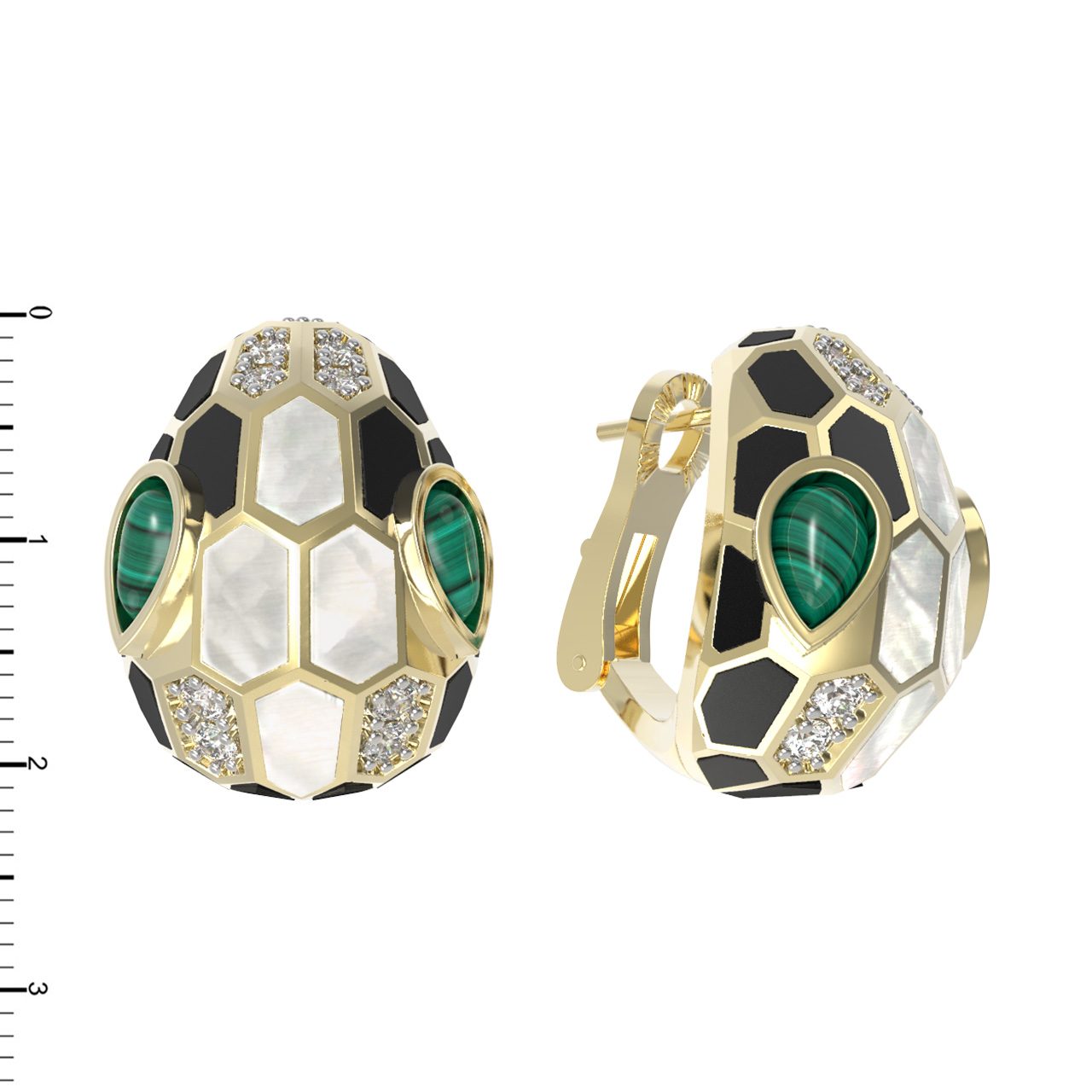 Серьги из лимонного золота c бриллиантами, рубином, ониксом, малахитом и перламутром