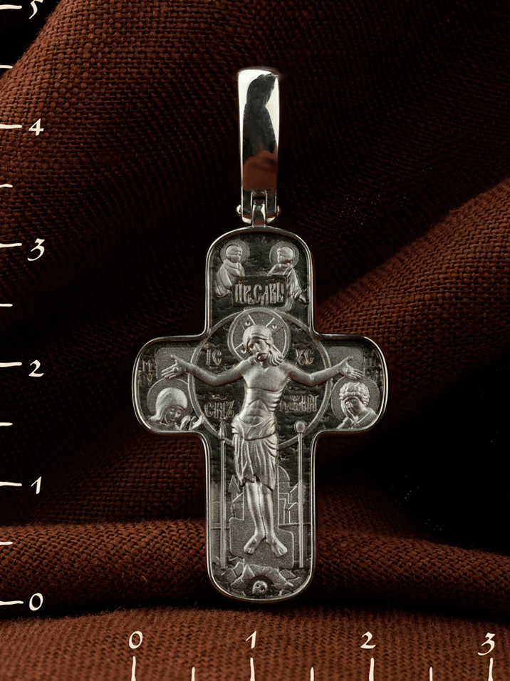 На лицевой стороне креста изображено Распятие Господа и Спасителя нашего Иисуса Христа. Христос, подвергнутый на кресте мучительной казни, своими страданиями искупил нас от древнего греха и даровал нам жизнь вечную. Без Распятия не было бы Воскресения Христова, и поэтому Крест из орудия казни обратился в святыню, в которой действует Благодать Божия. Над Распятием помещена надпись «Царь Славы». Распятие сопровождается надписями, олицетворяющими Христа: «IС» « ХС», что означает Иисус Христос и «Сын Божий». Над вершиной Распятия помещены изображения Ангелов.. Слева от Распятия изображена Пресвятая Богородица, справа — апостол и евангелист Иоанн Богослов, один из ближайших учеников Иисуса Христа. Возвышение, на котором стоит Крест, символизирует гору Голгофу, на которой произошло Распятие. Под подножием Креста изображена покоящаяся голова (череп) Адама