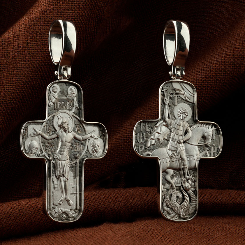 Основой композиции оборотной стороны креста является изображение Святого Великомученика Георгия Победоносца — одного из самых почитаемых и удивительных святых. На Руси он известен как Юрий или Егорий, покровитель воинов, помощник в крестьянском труде. На образке он изображен как воитель, сидящий на коне и поражающий копьем огнедышащего змея. Змей символизирует собою сатанинские силы. Молитвами вознесенными к Всевышнему и своей непреклонной верой он смог одолеть чудовище.. Над образом изображена благословляющая Божия десница.