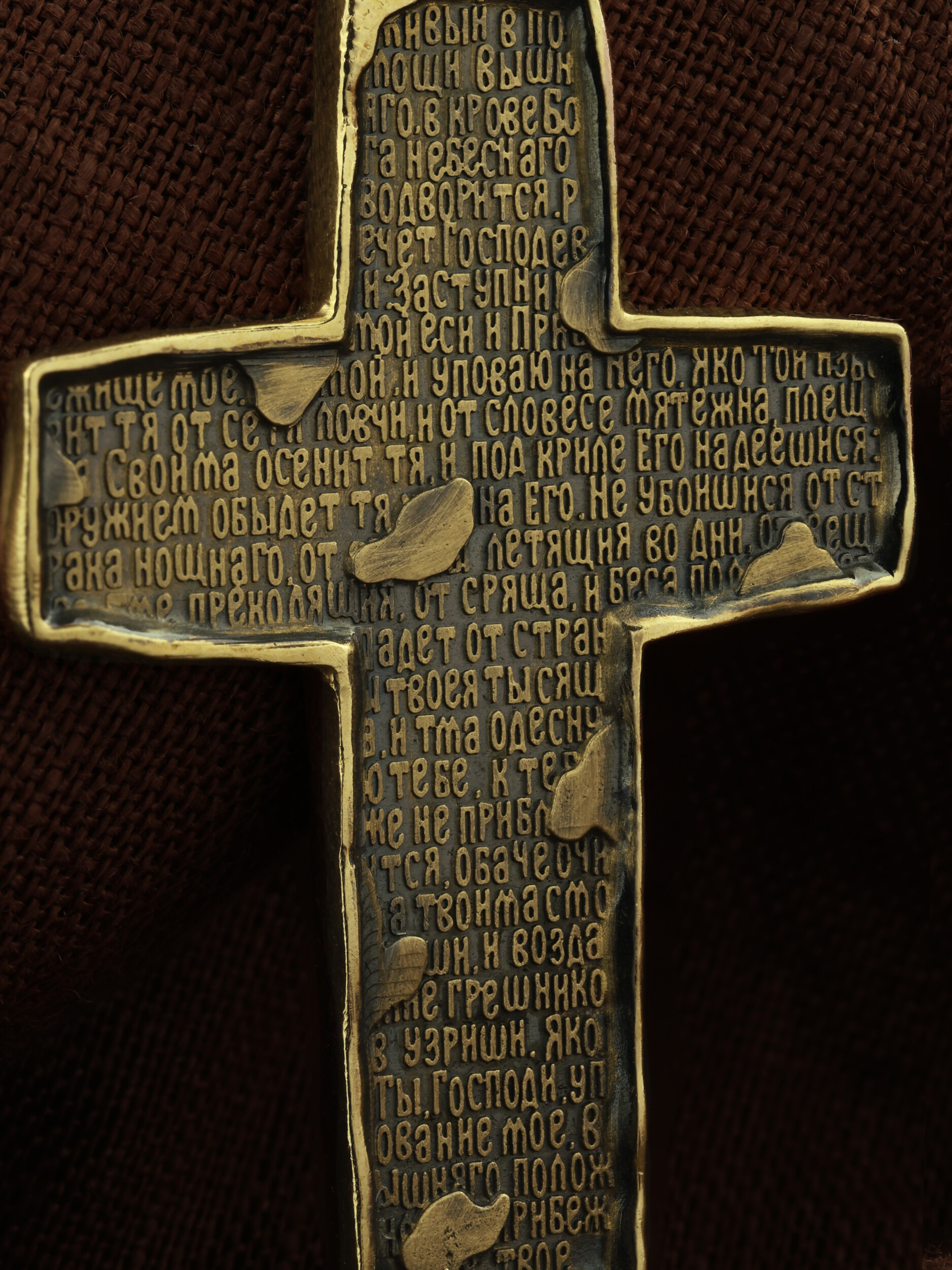 На оборотной стороне креста размещена часть 90 псалма царя Давида: «Живый в помощи Вышняго, в крове Бога Небеснаго водворится. Речет Господеви: Заступник мой еси и Прибежище мое, Бог мой, и уповаю на Него. Яко Той избавит тя от сети ловчи, и от словесе мятежна, плещма Своима осенит тя, и под криле Его надеешися: оружием обыдет тя истина Его. Не убоишися от страха нощнаго, от стрелы летящия во дни, от вещи во тме преходящия, от сряща, и беса полуденнаго. Падет от страны твоея тысяща, и тма одесную тебе, к тебе же не приближится, обаче очима твоима смотриши, и воздаяние грешников узриши. Яко Ты, Господи, упование мое, Вышняго положил еси прибежище твое. Не приидет к тебе зло, и рана не приближится телеси твоему, яко Ангелом Своим заповесть о тебе, сохранити тя во всех путех твоих. На руках возмут тя, да не когда преткнеши о камень ногу твою, на аспида и василиска наступиши, и попереши льва и змия. Яко на Мя упова, и избавлю и: покрыю и, яко позна имя Мое. Воззовет ко Мне, и услышу его: с ним есмь в скорби, изму его, и прославлю его, долготою дней исполню его, и явлю ему спасение Мое.»