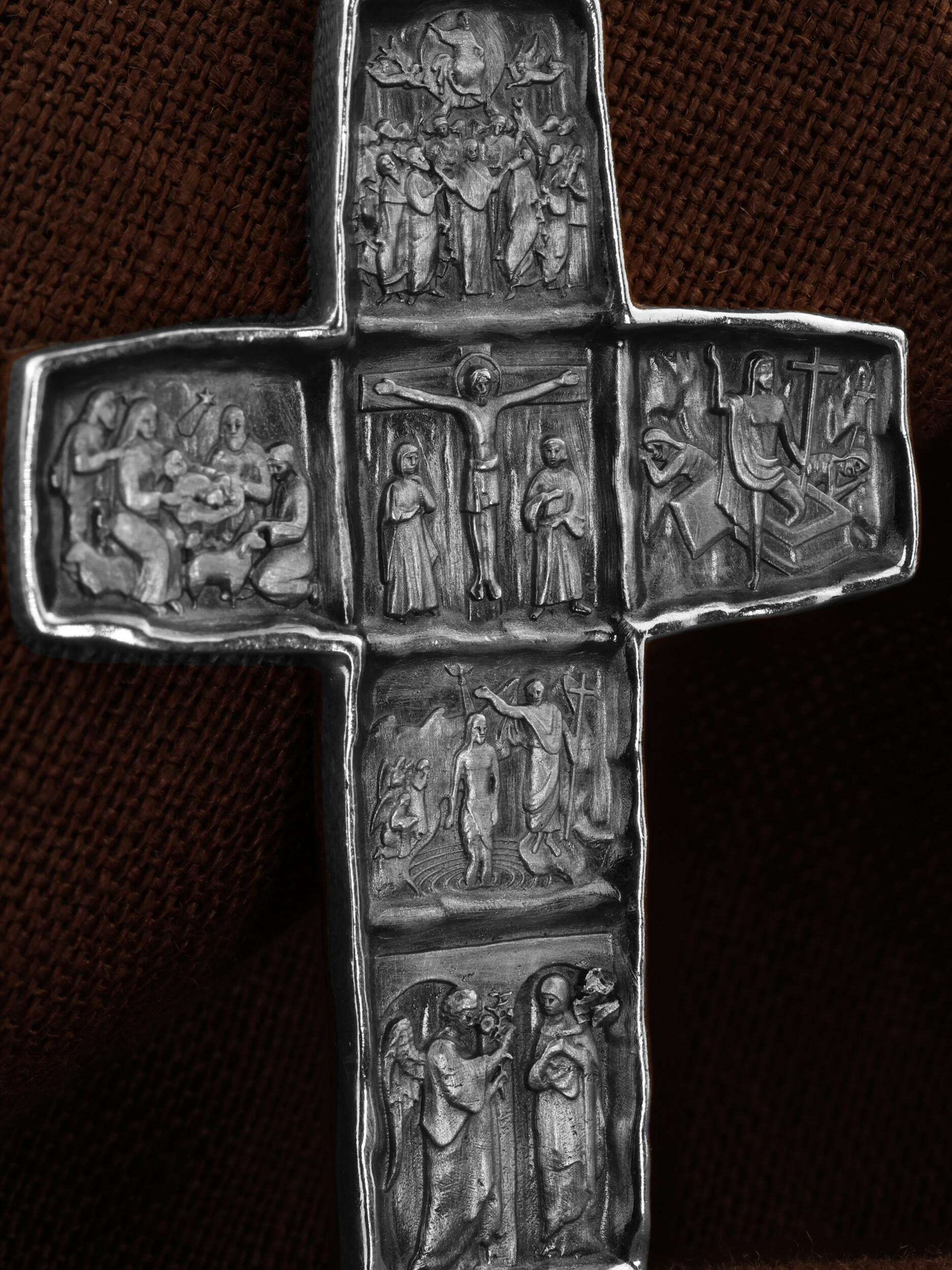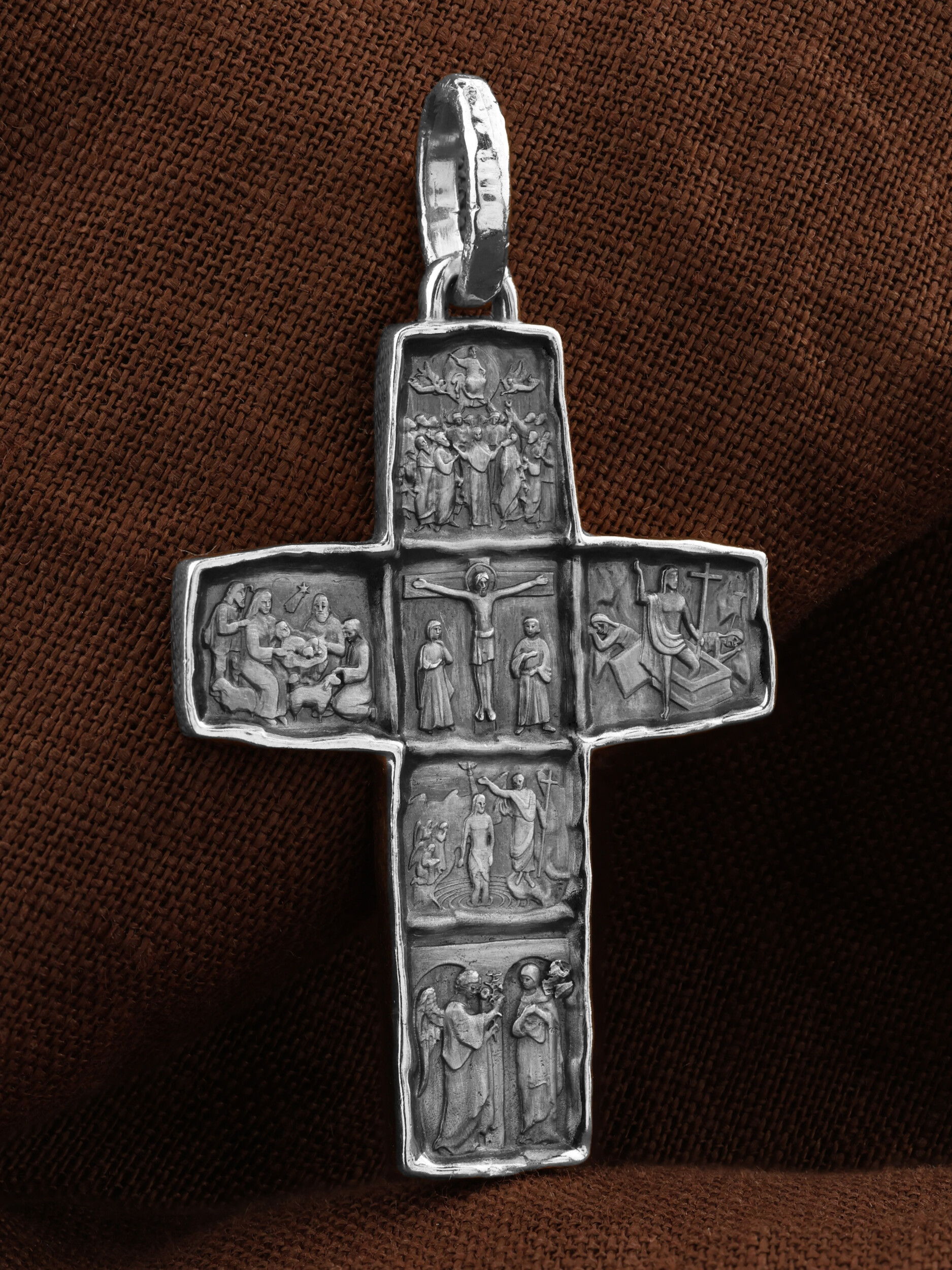 На лицевой стороне креста изображены основные события земной жизни, Крестные Страдания, Воскресение и Вознесение Господа и Спасителя нашего Иисуса Христа. Крест — символ спасения и искупления рода человеческого, знамение победы над смертью и адом. Иисус Христос, как искупительная жертва освобождения человечества от власти греха, умер крестной смертью и в третий день воскрес. В центре креста изображено Распятие Иисуса Христа на Кресте. Ниже Распятия размещено изображение Благовещения Пресвятой Богородицы, а так же Крещение Господне. Слева от Распятия изображено Рождество Господне, справа отображен образ Воскресшего из гроба Господа и Спасителя нашего Иисуса Христа. Над Распятием изображено Вознесение Господне.
