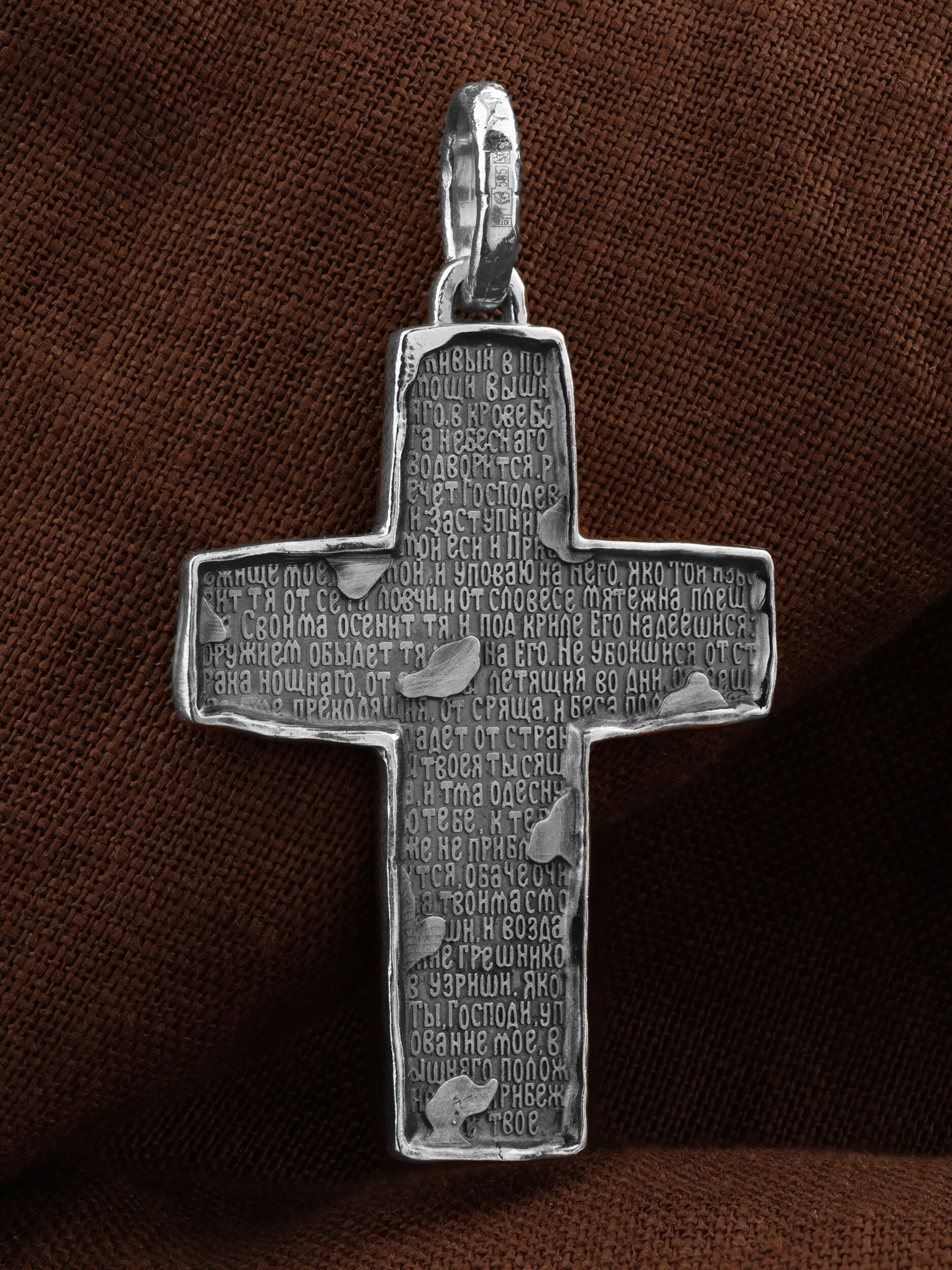 На оборотной стороне креста размещена часть 90 псалма царя Давида: «Живый в помощи Вышняго, в крове Бога Небеснаго водворится. Речет Господеви: Заступник мой еси и Прибежище мое, Бог мой, и уповаю на Него. Яко Той избавит тя от сети ловчи, и от словесе мятежна, плещма Своима осенит тя, и под криле Его надеешися: оружием обыдет тя истина Его. Не убоишися от страха нощнаго, от стрелы летящия во дни, от вещи во тме преходящия, от сряща, и беса полуденнаго. Падет от страны твоея тысяща, и тма одесную тебе, к тебе же не приближится, обаче очима твоима смотриши, и воздаяние грешников узриши. Яко Ты, Господи, упование мое, Вышняго положил еси прибежище твое. Не приидет к тебе зло, и рана не приближится телеси твоему, яко Ангелом Своим заповесть о тебе, сохранити тя во всех путех твоих. На руках возмут тя, да не когда преткнеши о камень ногу твою, на аспида и василиска наступиши, и попереши льва и змия. Яко на Мя упова, и избавлю и: покрыю и, яко позна имя Мое. Воззовет ко Мне, и услышу его: с ним есмь в скорби, изму его, и прославлю его, долготою дней исполню его, и явлю ему спасение Мое.»