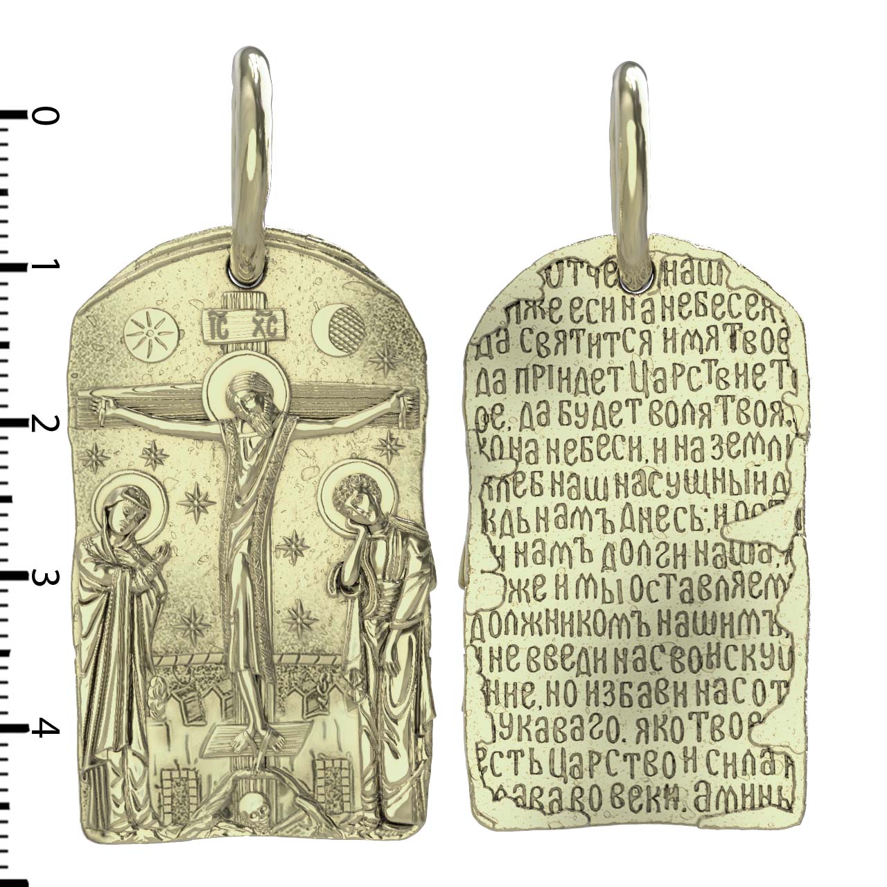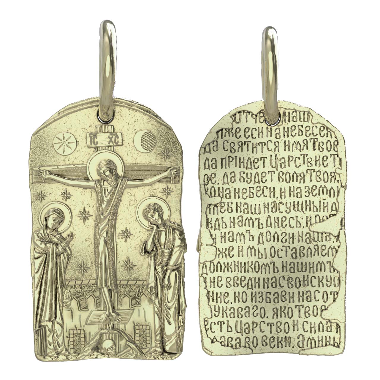 На лицевой стороне образка изображено Распятие Господа и Спасителя нашего Иисуса Христа. Своими крестными страданиями Господь смыл наши грехи, покрыл наш долг перед Богом. В Голгофе сокрыта непостижимая тайна бесконечной правды и любви Бога. Крест стал символом победы добра над злом, жизни над смертью, напоминанием бесконечной Божьей любви, предметом радости. Воплотившийся Сын Божий Своею кровью освятил крест и сделал его проводником Своей благодати, источником освящения верующих. На верхней табличке, выше головы Иисуса, написано сокращенно имя Спасителя «IC» «XC» — Иисус Христос. Слева от Распятия стоят оплакивающие Господа Пресвятая Богородица, справа — апостол и евангелист Иоанн Богослов, один из ближайших учеников Иисуса Христа. По преданию, увидя, что они горько плачут, Иисус сказал Матери Своей: «Жено! Се сын Твой!» Потом сказал ученику Иоанну: «Се мати твоя». С этого времени Иоанн взял Матерь Божию к себе, и Она жила в его доме до самой смерти.