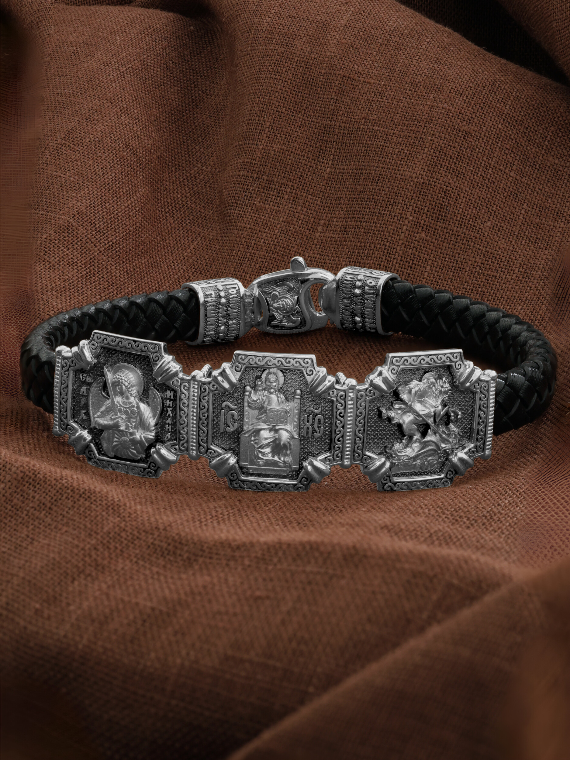 Композиционным центром браслета является Иисус Христос в образе Вседержителя, по-гречески «Пантократор». Это древнейший образ Спасителя, на котором Он представлен как властелин и правитель мира. Христос держит в руках Книгу, которая символизирует Книгу Бытия, то есть весь сотворенный Богом мир. В этой Книге судьбы всех людей, живущих на земле. Слева от образа Вседержителя — икона Архангела Михаила — Архистратига всех Небесных Воинств. Он ведет непримиримую войну против сил зла, охраняет райские врата и защищает души людей. Его имя означает «Кто яко Бог?», так как он самый могучий и грозный враг зла. Он первым ополчился на Денницу, когда тот восстал против Бога, низверг его с Неба и не перестает сражаться с его темным воинством. Поэтому он часто изображается в виде воина, в доспехах и с огненным мечом. Справа от образа Вседержителя — Великомученик Георгий Победоносец. Образ Великомученика считают одним из наиболее чтимых святынь в Святыни Православных, он олицетворяет собой заступника для верующих, чья жизнь имеет какое-либо отношение к военным делам, также он может оберегать и землевладельцев. Одно из самых великих чудес которое сотворил Великомученик так это — спасения всего города от устрашающего змия. Молитвами и своей непреклонной верой, взываемой к Всевышнему, он смог одолеть чудовище. Святой убил змея, спас жителей и их души от влияния дьявола, породив в них надежду и веру в Господа, призывая людей принять христианскую веру. Поскольку при жизни Святой Георгий был военным, он считается покровителем всех, кто имеет отношение к армии — военнослужащим, участникам боевых действий. Молитва перед иконой Георгия Победоносца поможет защититься от врагов, одержать победу в сражении (военном, спортивном, духовной брани с дьяволом), содействие в установлении мир