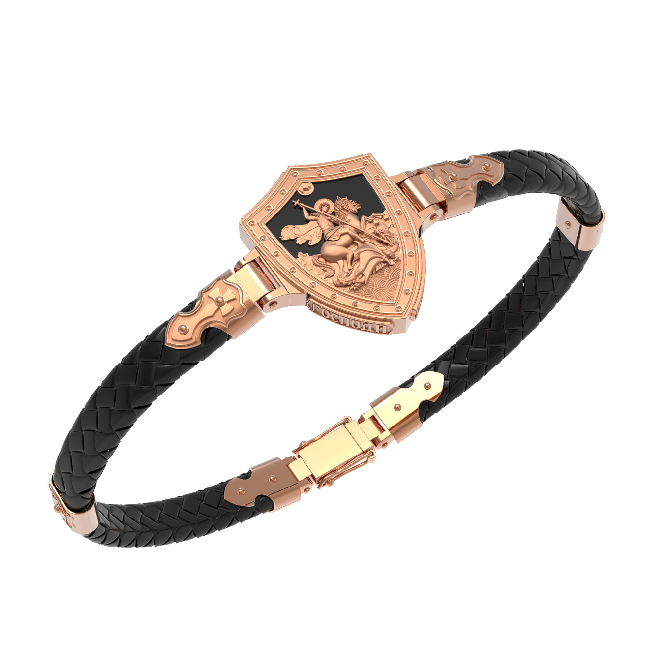 Основой композиции лицевой стороны браслета является изображение Святого Великомученика Георгия Победоносца — одного из самых почитаемых и удивительных святых. Георгий родился в Каппадокии (Малая Азия) в семье богатых и знатных горожан. Юношей поступил на службу к римскому императору Диоклетиану, за отличное знание военного дела и проявленную в боях и походах храбрость был приближен к императору и удостоен высокого воинского звания. Во время начавшихся гонений на христиан, перешел на сторону гонимых и, отвергнув человеческий страх, стал ярым проповедником учения Христа. Мучители подвергли опального воеводу жесточайшим восьмидневным пыткам и казнили его (обезглавили) в возрасте около тридцати лет в 303 году. На Руси он известен как Юрий или Егорий, заступник для верующих, чья жизнь имеет какое-либо отношение к военным делам, помощник в крестьянском труде. Браслет сделан в виде воинского щита. На нем Георгий изображен как воитель, сидящий на вздыбленном коне и поражающий копьем огнедышащего змея. Над образом изображена благословляющая Божия десница. Змей символизирует собою сатанинские силы. Молитвами вознесенными к Всевышнему и своей непреклонной верой он смог одолеть чудовище. Святой убил змея, спас царскую дочь, принесенную в жертву, и жителей города, их души от влияния дьявола, породив в них надежду и веру в Господа, призывая людей принять христианскую веру. На торце изделия помещена молитва: «Господи, помилуй мя грешного».