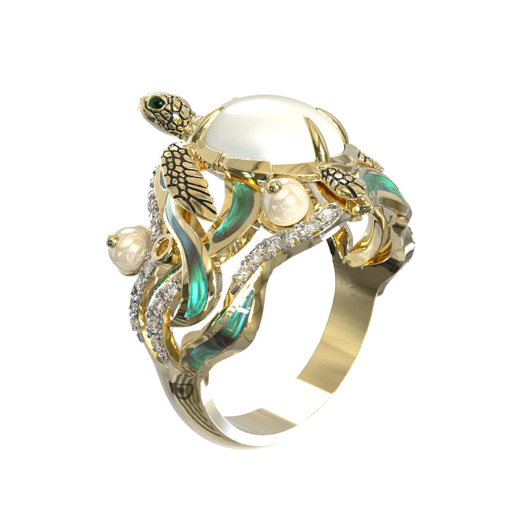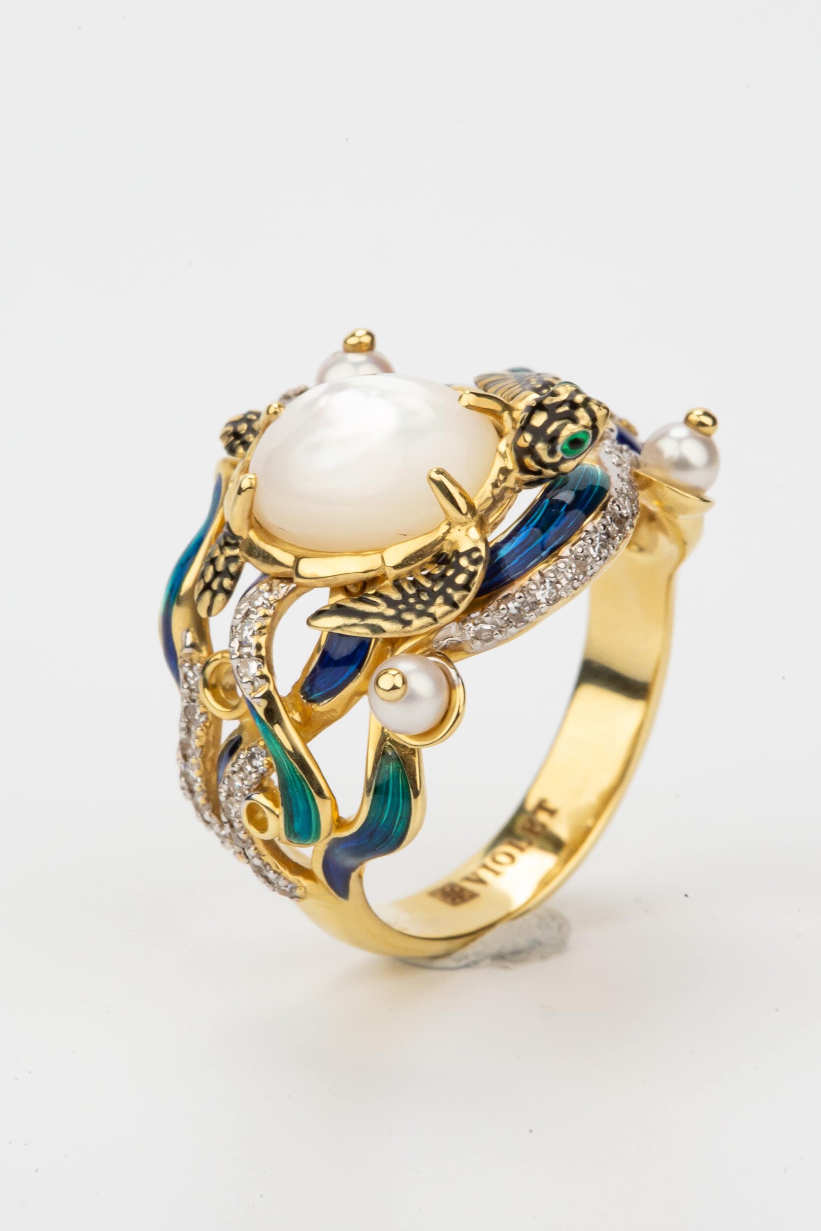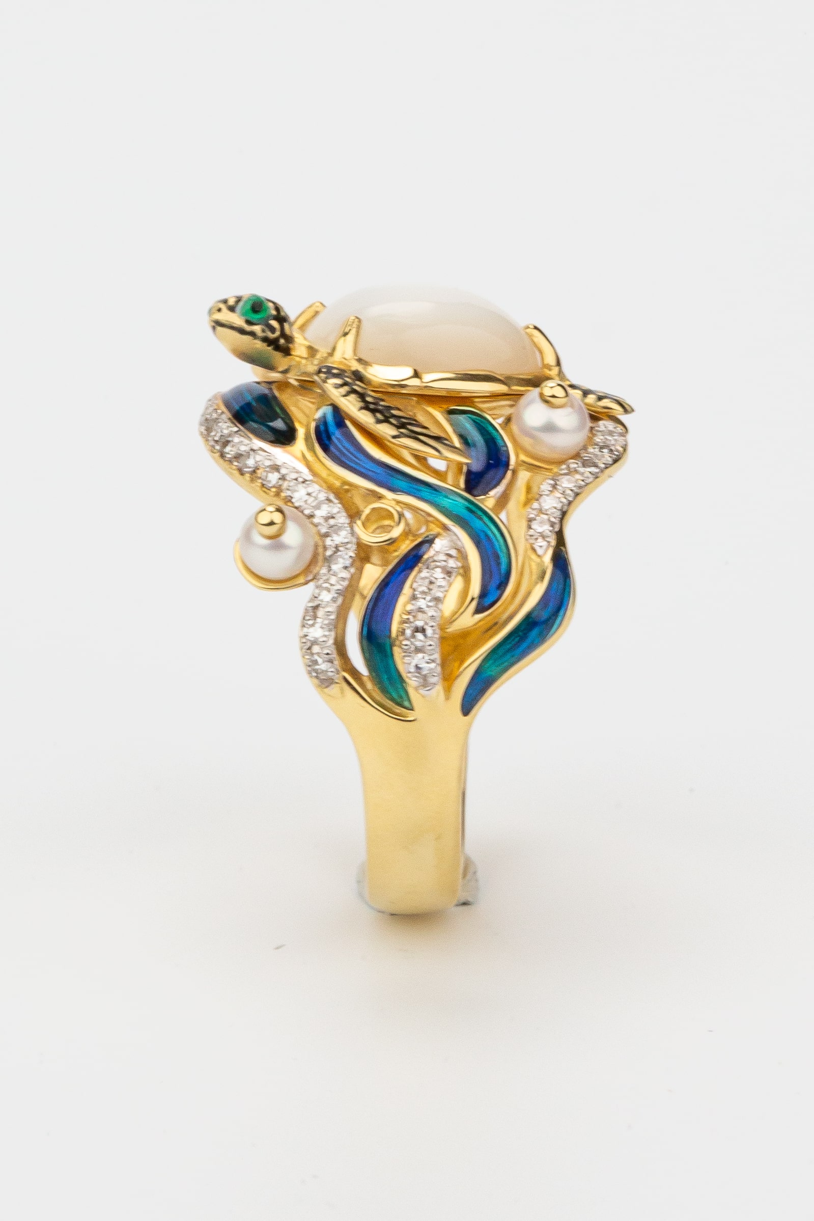 Кольцо из лимонного золота c эмалью, бриллиантами, жемчугом и перламутром