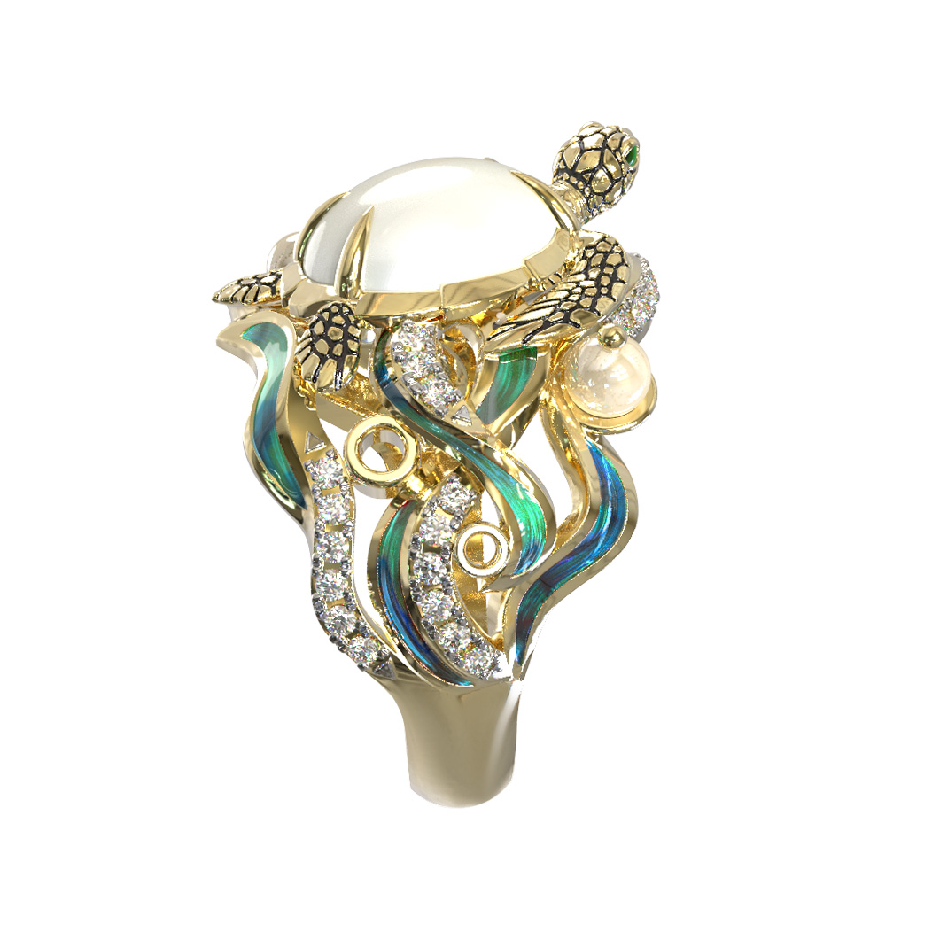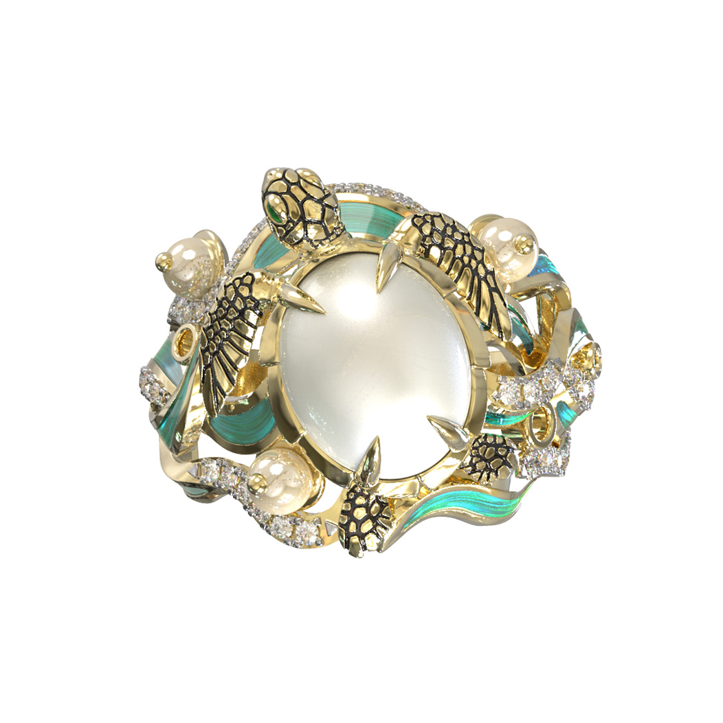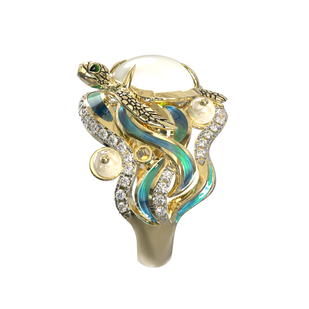 Кольцо из лимонного золота c эмалью, бриллиантами, жемчугом и перламутром
