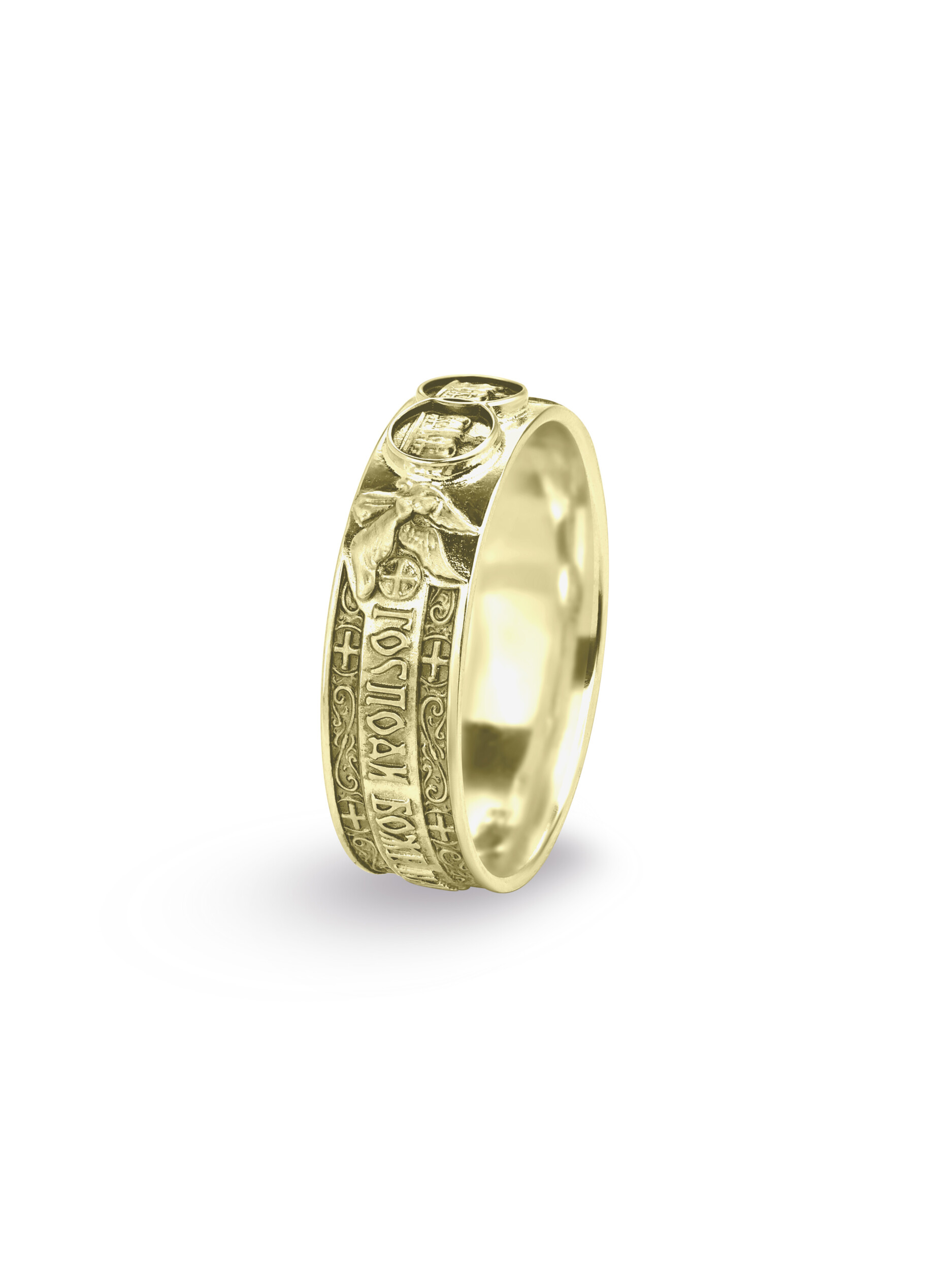 На лицевой стороне между Херувимов в кругах, символизирующих обручальные кольца, изображены венчальные венцы, и по кольцу написана молитва «Господи Боже Наш славою и честью венчай их»