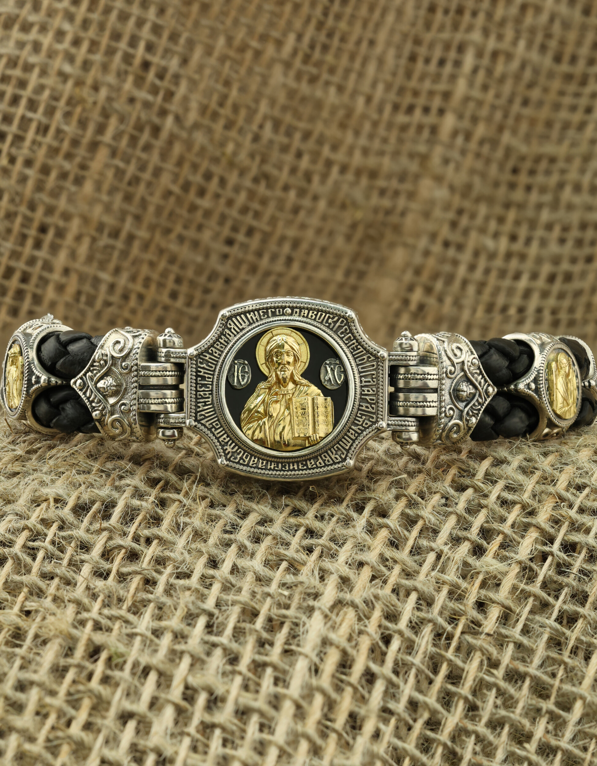 Браслет из серебра и золота c кожаным шнурком и ониксом