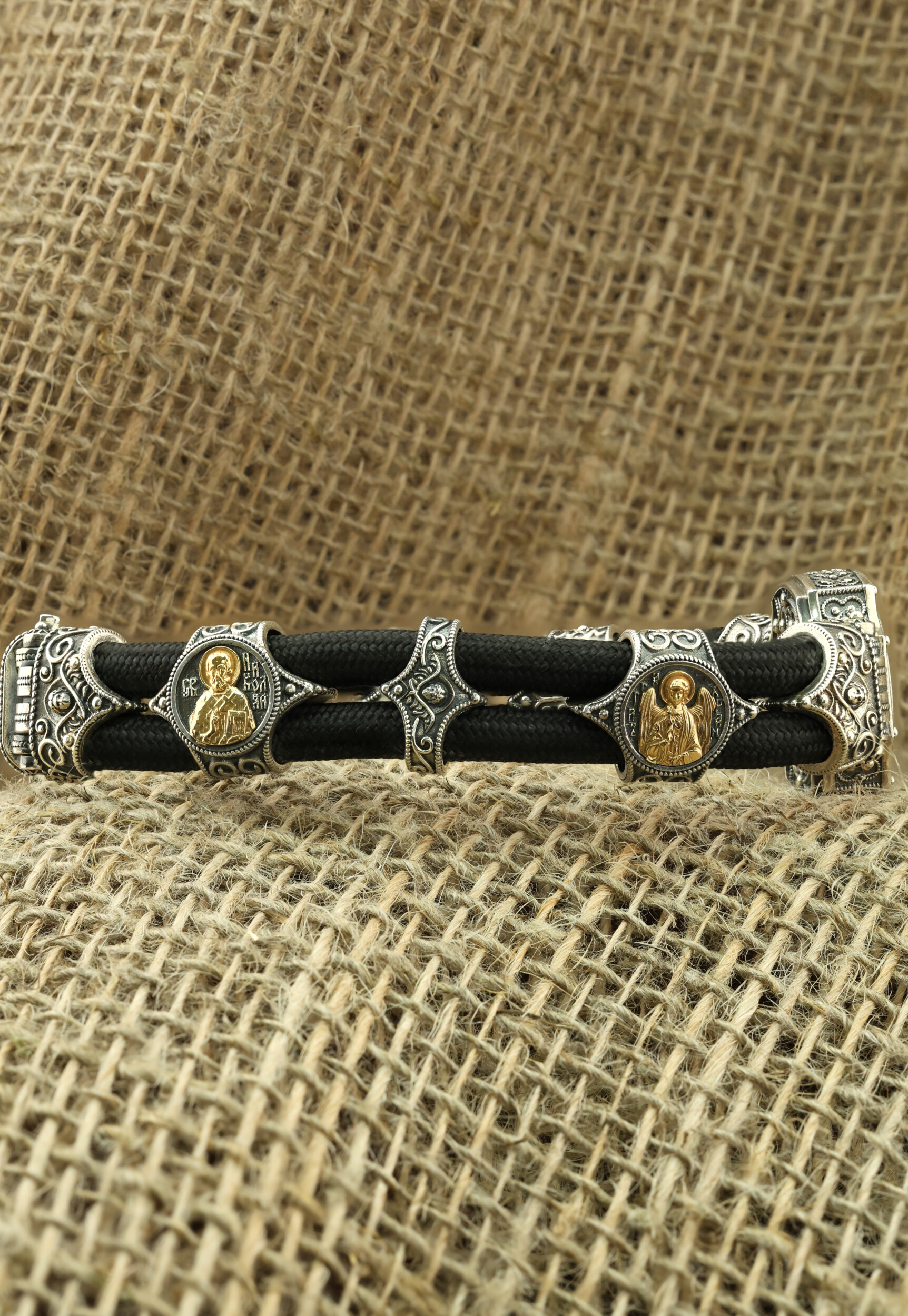 Браслет из серебра и золота c ониксом и шёлковым шнурком