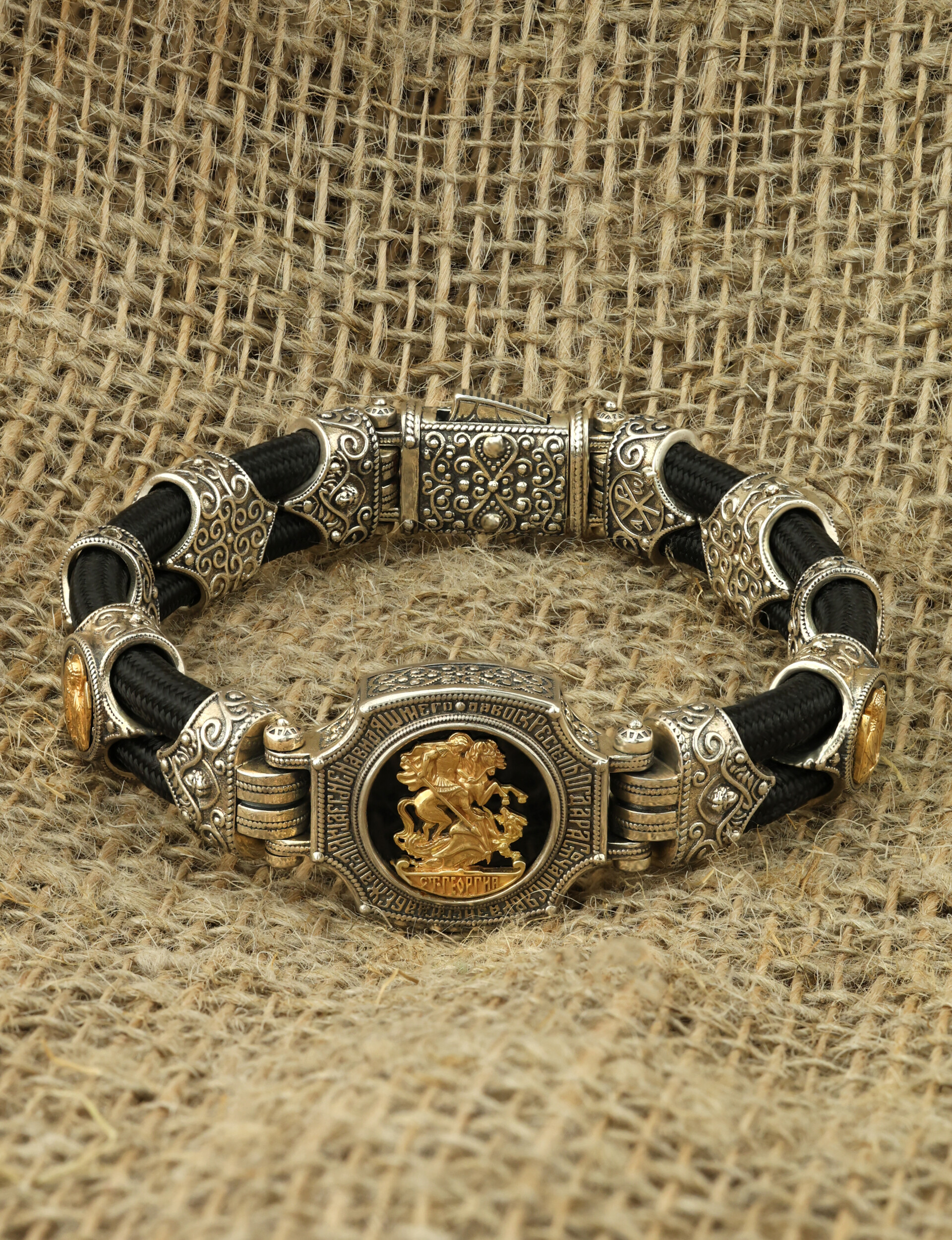 Браслет из серебра и золота c ониксом и шёлковым шнурком