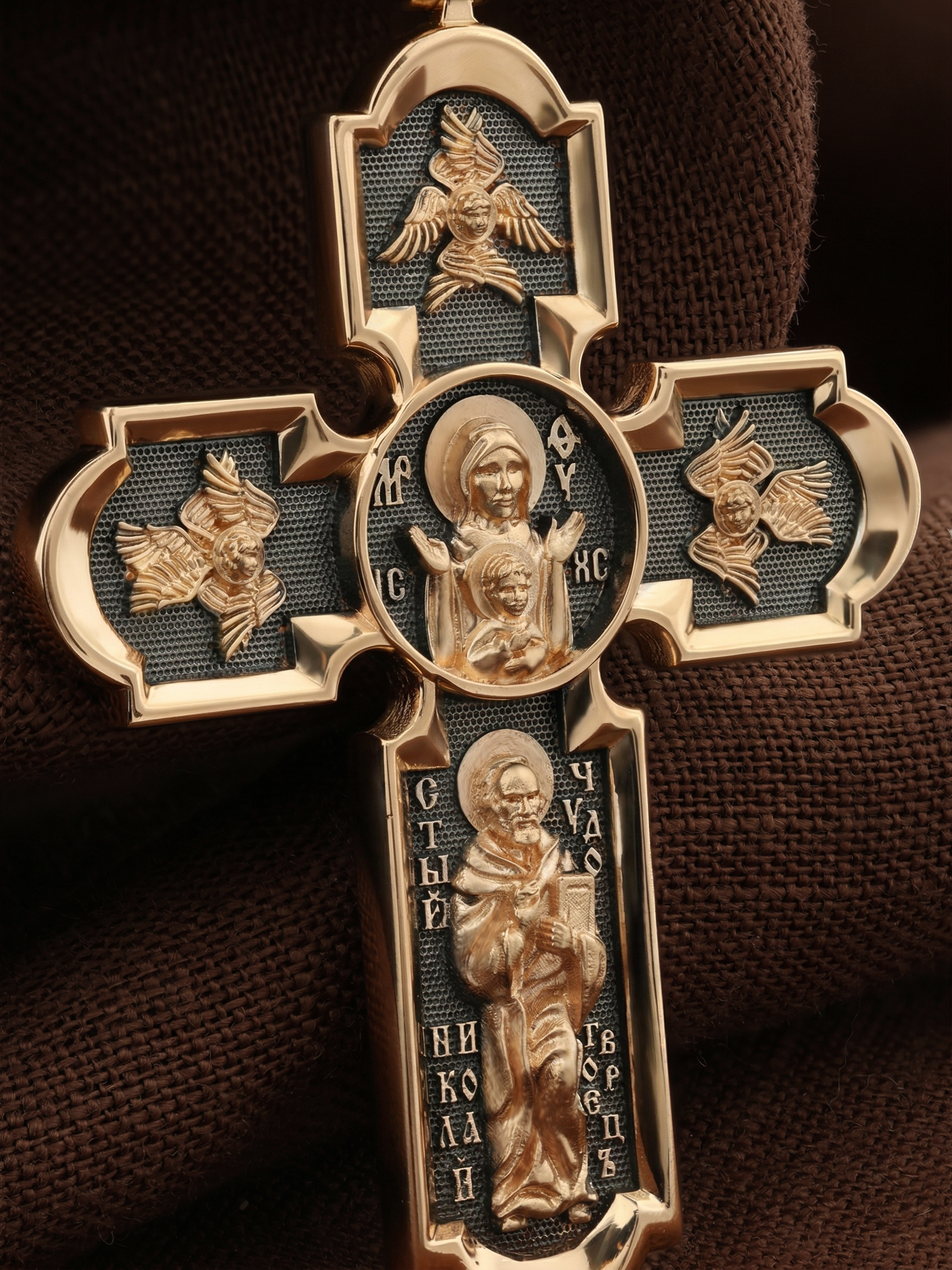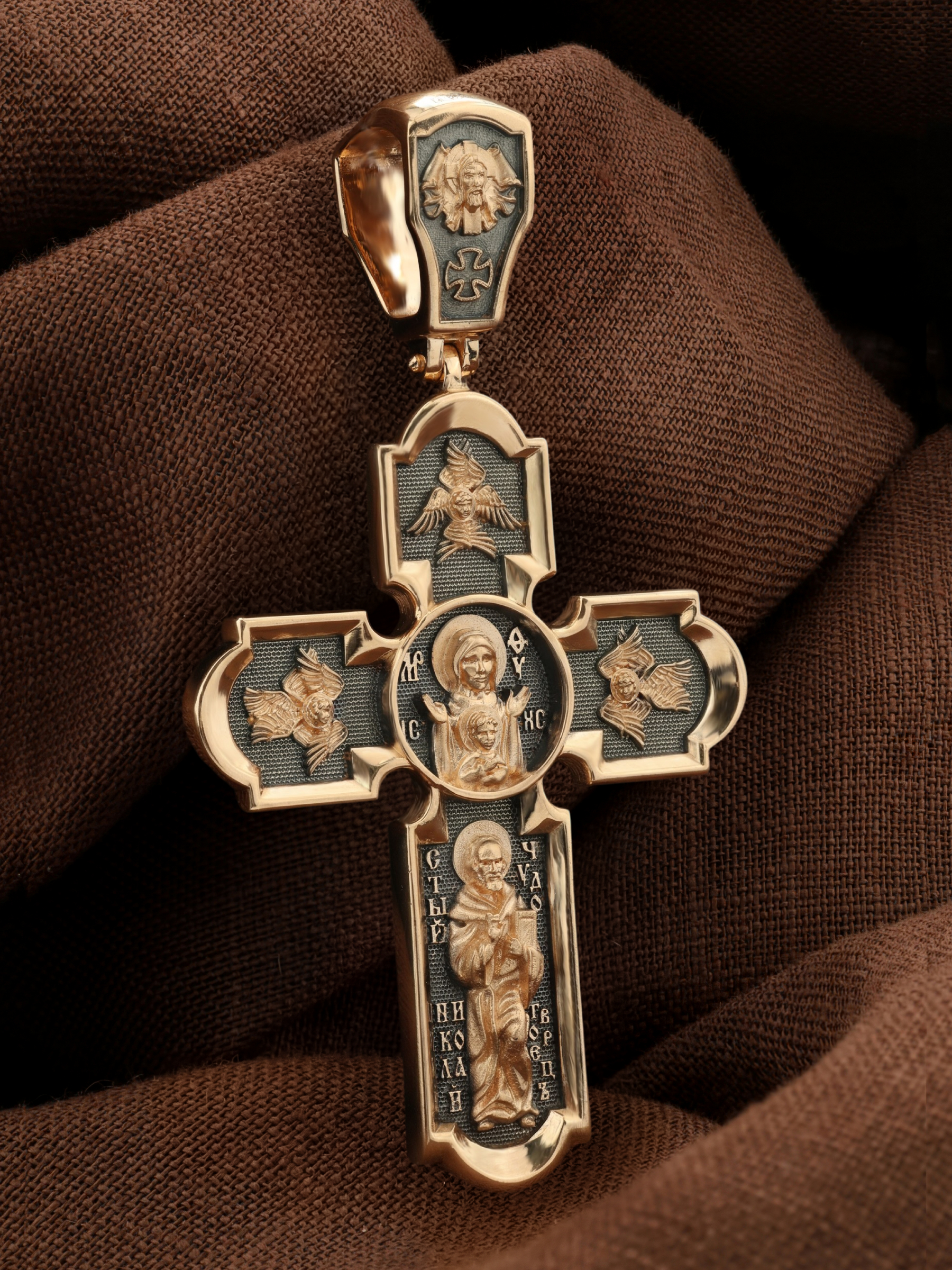 У основания креста в полный рост изображен самый любимый святой Православной Церкви — Николай Чудотворец. Святой почитается как целитель болезней, покровитель путешествующих, особенно по морю, помощник в торговле, учебе, а также в поисках достойного супруга.