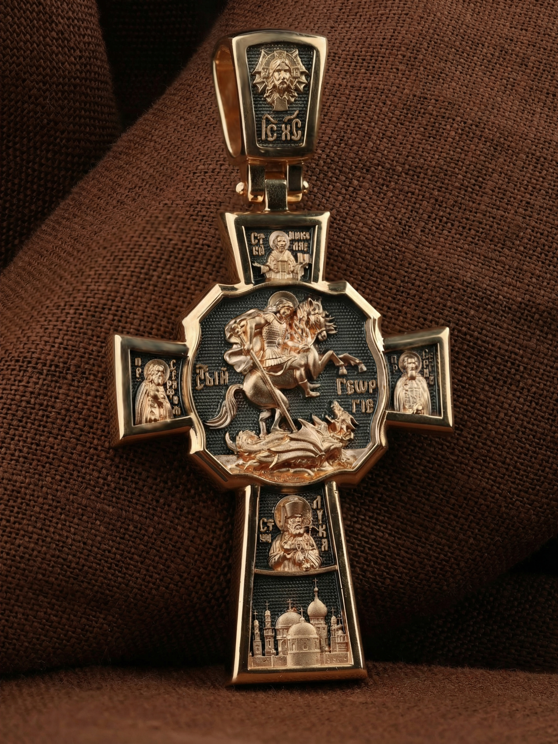 В центре оборотной стороне креста помещен образ Святого Великомученика Георгия Победоносца — одного из самых почитаемых и удивительных святых. На образке он изображен как воитель поражающий копьем огнедышащего змея. Змей символизирует собою сатанинские силы. Справа помещен образ Святого Преподобного Сергия, игумена Радонежского, чудотворца, слева — Преподобного Серафима Саровского, чудотвореца. Выше помещен образ Святителя Николая архиепископа Мир Ликийских, чудотвореца, ниже — образ святителя Луки (Войно-Ясенецкого), архиепископа Симферопольского и Крымского, исповедника и изображение Храма. На кулонном кольце изображен Спас Нерукотворный — образ Господа и Спасителя нашего Иисуса Христа, чудесно отпечатавшийся на плате, котором Христос вытер свой лик.