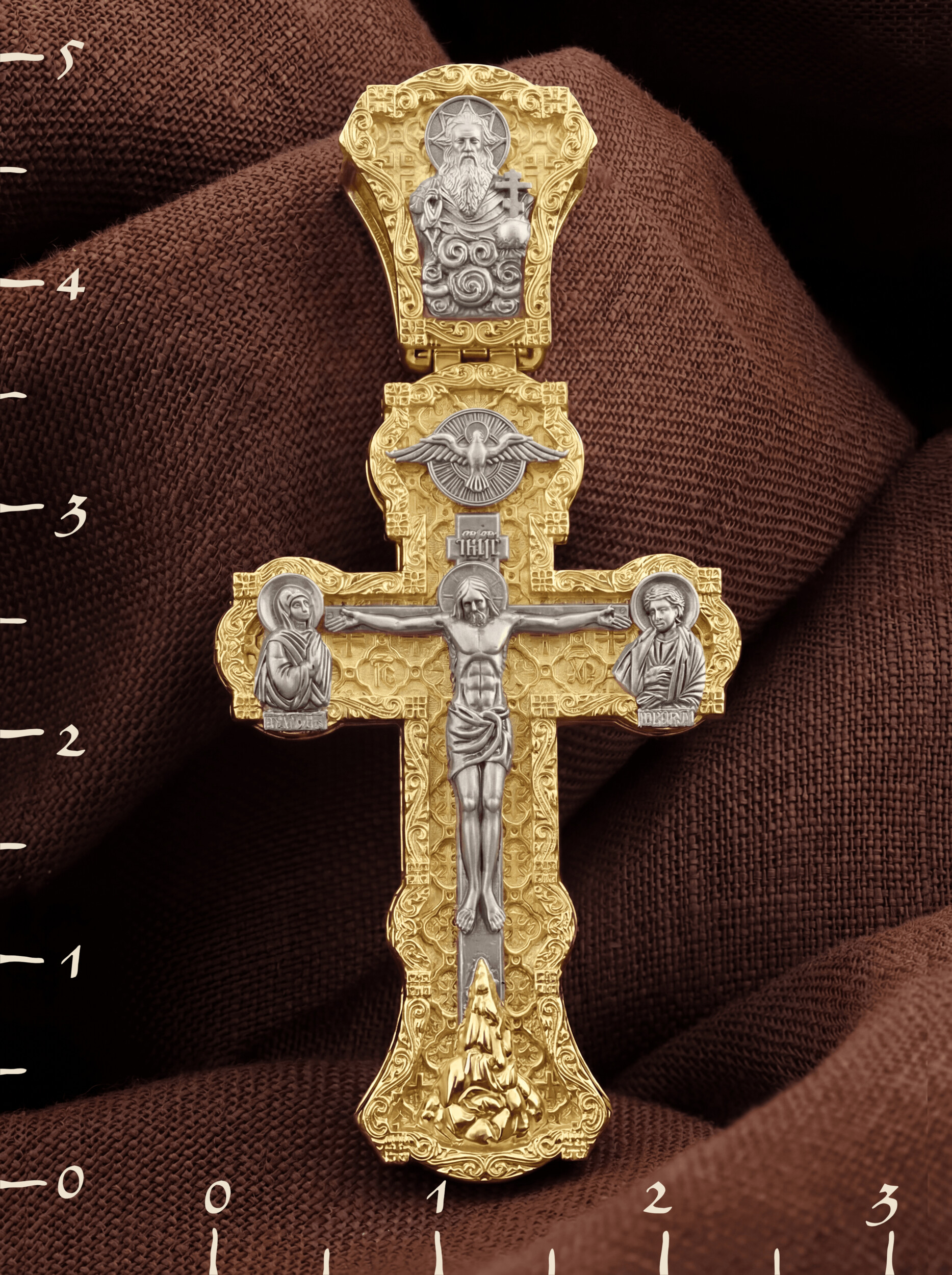 На лицевой стороне креста изображено Распятие Господа и Спасителя нашего Иисуса Христа. Христос, подвергнутый на кресте мучительной казни, своими страданиями искупил нас от древнего греха и даровал нам жизнь вечную. Без Распятия не было бы Воскресения Христова, и поэтому Крест из орудия казни обратился в святыню, в которой действует Благодать Божия. На верхней табличке, выше головы Иисуса, расположена надпись, составленная Понтием Пилатом на трех языках — «IНЦI». Она означает «Иисус Назорей, Царь Иудейский». Надпись «IС ХС» означает Иисус Христос и помещается на разных сторонах поперечной (большой) перекладины креста. Крест стоит на горе камней, символизирующих Голгофу. В ее основании различается череп– это голова Адама. У Креста стоят оплакивающие Господа Божия Матерь и апостол Иоанн Богослов. Из всех апостолов об одном лишь Иоанне Богослове говорится, что он стоял на Голгофе у креста Спасителя, не заботясь о собственной безопасности. Он услышал обращенные к Ней с высоты Креста слова Распятого Господа: «Жено, се сын Твой» и к нему: «Се Мати твоя». С этого времени Иоанн взял Матерь Божию к себе, и Она жила в его доме до самой смерти. Над Распятием — изображение Духа Святого в виде голубя, сходящего с Небес. На кулонном кольце изображен Бог Отец.