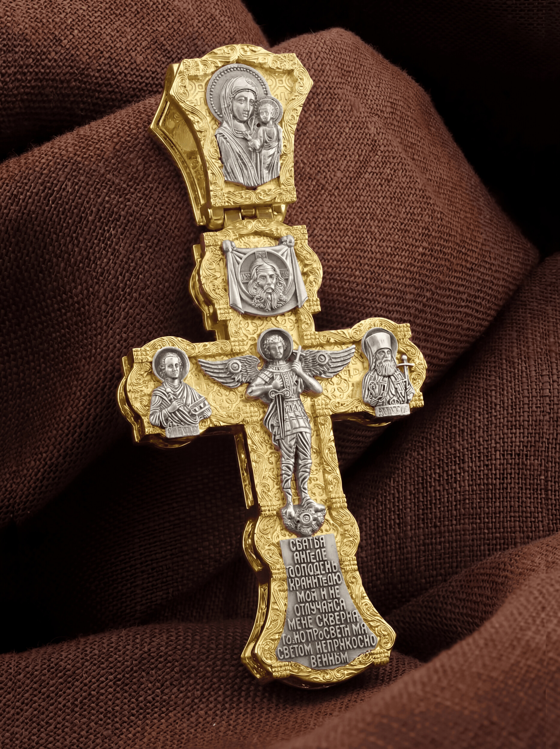 В центральной части оборотной стороны креста изображен Святой Ангел-Хранитель в виде прекрасного юноши держащего в правой руке меч, а в левой — крест. Ангел-Хранитель — это Ангел приставляемый Богом к человеку при крещении для охраны и помощи в добрых делах. Невидимо пребывая при нас постоянно, он наставляет нас на все доброе и полезное, охраняют и защищают нас от врагов видимых и невидимых, ходатайствует за нас пред Богом. Ниже образа помещена молитва: «Святый Ангел Господень Хранитель мой, и не отлучайся от Меня скверного, но просвети меня светом неприкосновенным.» Выше образа изображен Спас Нерукотворный — образ Господа и Спасителя нашего Иисуса Христа, чудесно отпечатавшийся на плате, котором Христос вытер свой лик. Слева — Святой великомученик и целитель Пантелеи¬мон. Господь даровал удивительную силу его молитве. Ею он исцелял любые болезни, воскрешал мертвых. Справа помещен образ Святителя Луки (Войно-Ясенецкого), русского святителя, исповедника, духовного писателя, доктора богословия, а также выдающегося ученого. На кулонном кольце изображена Казанская икона Божией Матери — одна из самых любимых на Руси.