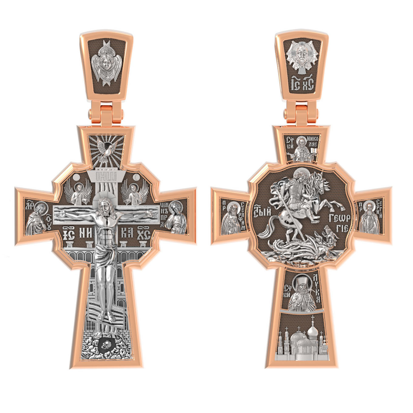 В центре оборотной стороне креста помещен образ Святого Великомученика Георгия Победоносца — одного из самых почитаемых и удивительных святых. На образке он изображен как воитель поражающий копьем огнедышащего змея. Змей символизирует собою сатанинские силы. Справа помещен образ Святого Преподобного Сергия, игумена Радонежского, чудотворца, слева — Преподобного Серафима Саровского, чудотвореца. Выше помещен образ Святителя Николая архиепископа Мир Ликийских, чудотвореца, ниже — образ святителя Луки (Войно-Ясенецкого), архиепископа Симферопольского и Крымского, исповедника и изображение Храма. На кулонном кольце изображен Спас Нерукотворный — образ Господа и Спасителя нашего Иисуса Христа, чудесно отпечатавшийся на плате, котором Христос вытер свой лик.