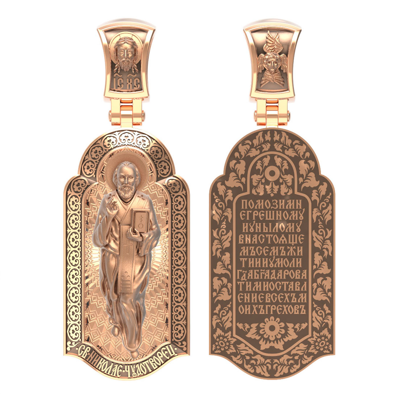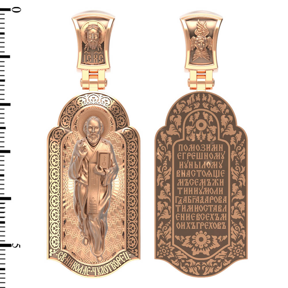 На лицевой стороне образка изображен Святитель Николай архиепископ Мир Ликийских, Чудотворец. Он является одним из самых почитаемых святых в православном мире. Избранник Божий Николай стал вершиной всех добродетелей. С кем из величайших праведников не сравнялся он образом духовной красоты, кому из них не последовал в своих деяниях и чудотворениях? Всеблаженный Николай был кроток, как Моисей, мужественен, как Давид, славен простотой нрава, как Иаков. Словно Ной, он спасал стадо Господне в новом ковчеге от потопа ересей. Вся жизнь святого Николая — это служение Богу. Много великих чудес сотворил на земле и на море великий Святитель Николай Угодник. Он укрощал штормы, спасал от потопления и выносил на сушу из глубины морской, освобождал из плена и приносил освобожденных домой, избавлял от уз и темницы, освобождал от смерти и подавал многим различные исцеления: слепым — прозрение, хромым — хождение, глухим — слух.