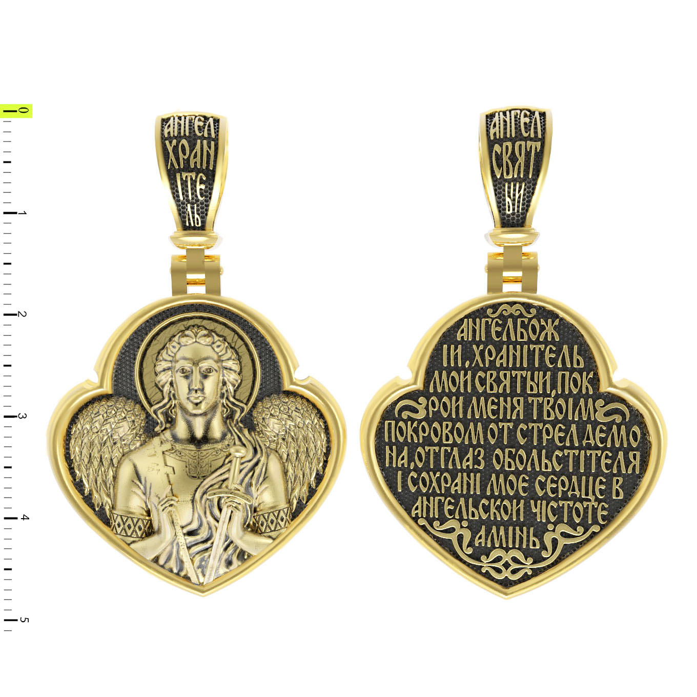 На лицевой стороне образка изображен Святой Ангел-Хранитель в виде прекрасного, светозарного юноши держащего в правой руке крест, а в левой — мечь. А? нгел-Хранитель — это Ангел приставляемый Богом к человеку при крещении для охраны и помощи в добрых делах. Он невидимо находится при человеке на протяжении всей его жизни, если человек сохраняет в себе любовь к Богу и истинную веру перед Ним. Ангел-Xранитель делают для нас все, что служит к истинному нашему благу и спасению. Невидимо пребывая при нас постоянно, он, руководствуя нас ко спасению, не только по нашему желанию таинственно наставляет нас на все доброе и полезное, не только возносит наши молитвы к Богу, но еще и сам от себя охраняют и защищают нас от врагов видимых и невидимых и ходатайствует за нас пред Богом.