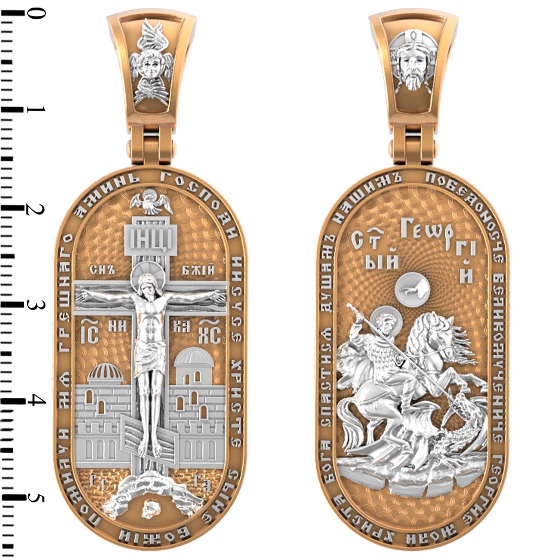 По контуру написана молитва: «Победоносче Великомучениче Георгие, моли Христа Бога спастися душам нашим». На кулонном кольце изображен Спас Нерукотворный — Символ вочеловечившегося Божества.