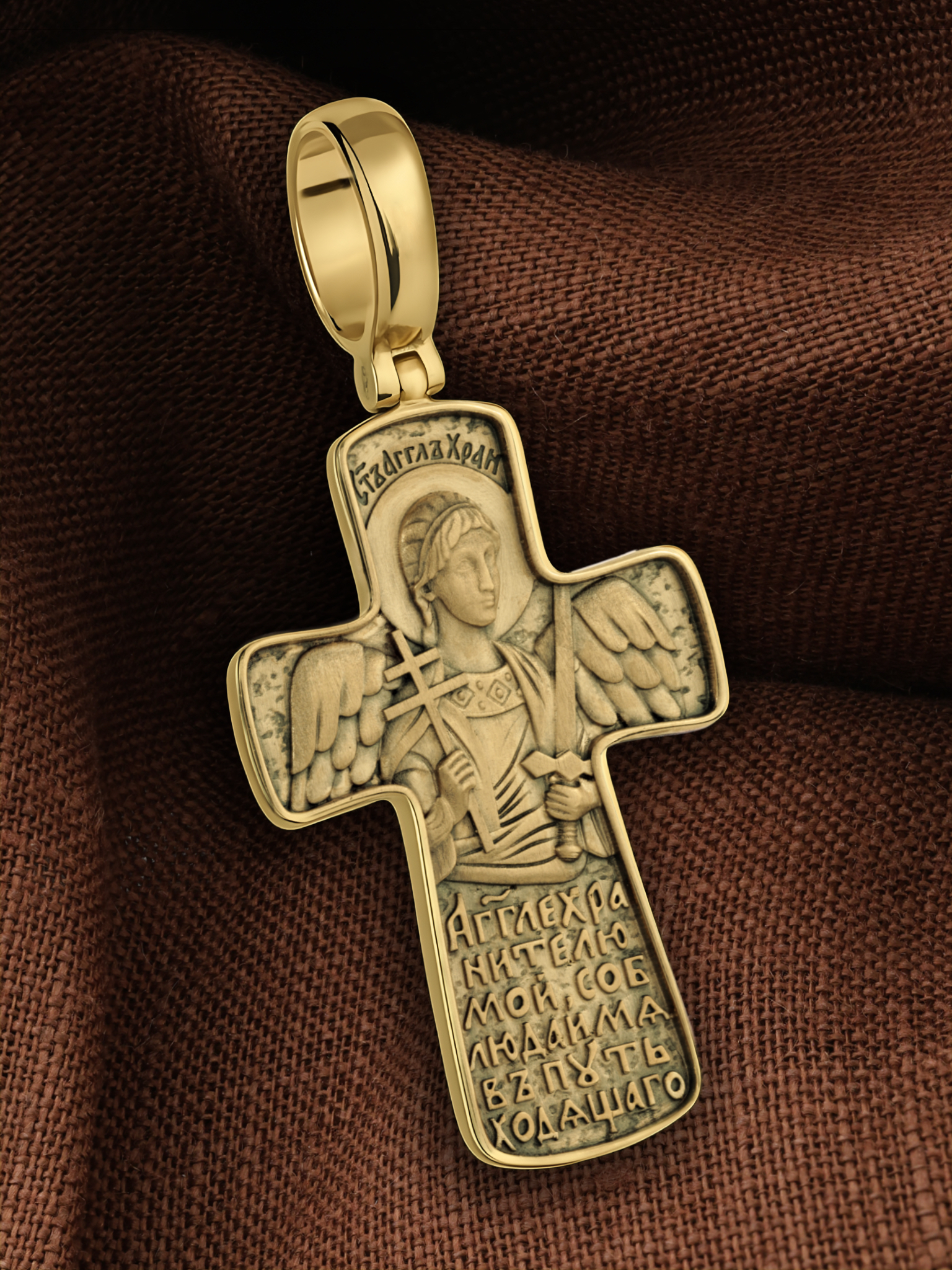 На оборотной стороне креста изображен Святой Ангел-Хранитель держащий в правой руке крест, а в левой — меч. Ангел-Хранитель — это Ангел приставляемый Богом к человеку при крещении для охраны и помощи в добрых делах. Он невидимо находится при человеке на протяжении всей его жизни, если человек сохраняет в себе любовь к Богу и истинную веру перед Ним. Ангел-Xранитель делают для нас все, что служит к истинному нашему благу и спасению. Невидимо пребывая при нас постоянно, он наставляет нас на все доброе и полезное, возносит наши молитвы к Богу, охраняют и защищают нас от врагов видимых и невидимых, ходатайствует за нас пред Богом. Ниже образа размещена молитва: «Ангеле-Хранителю мой, соблюдай мя в путь ходящего».