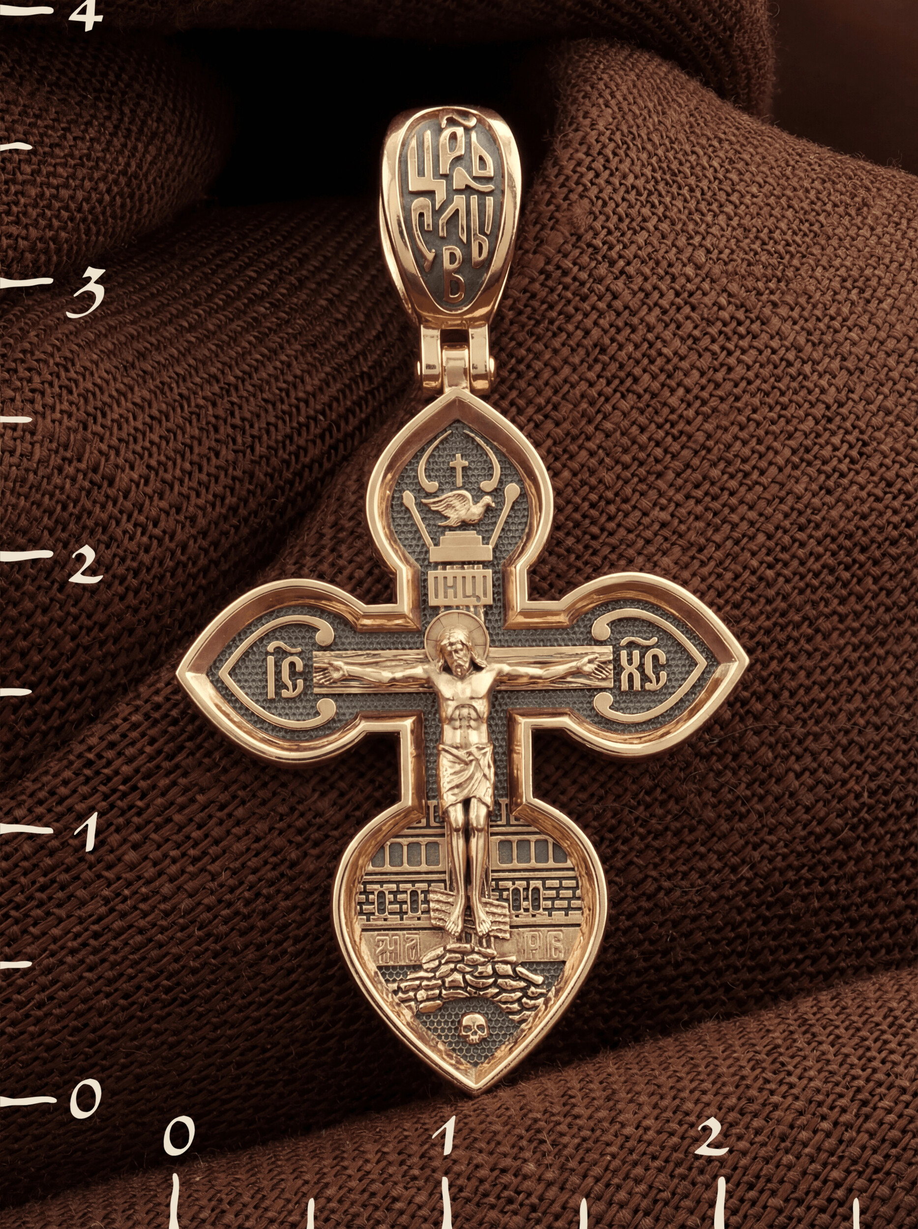 На лицевой стороне нательного креста изображено Распятие Господа нашего Иисуса Христа. Крест Господень стоит на небольшом каменистом возвышении, символизирующем гору Голгофу, которая обозначена буквами МЛРБ (Место Лобное Рай Бысть). Над головой Господа на поперечной перекладине написано «ИНЦИ», что символизирует табличку, которая была прибита к Кресту, с надписью «Иисус Назорей Царь Иудейский».По сторонам основной перекладины расположены позолоченные рельефные инициалы Христа «ИС ХС».